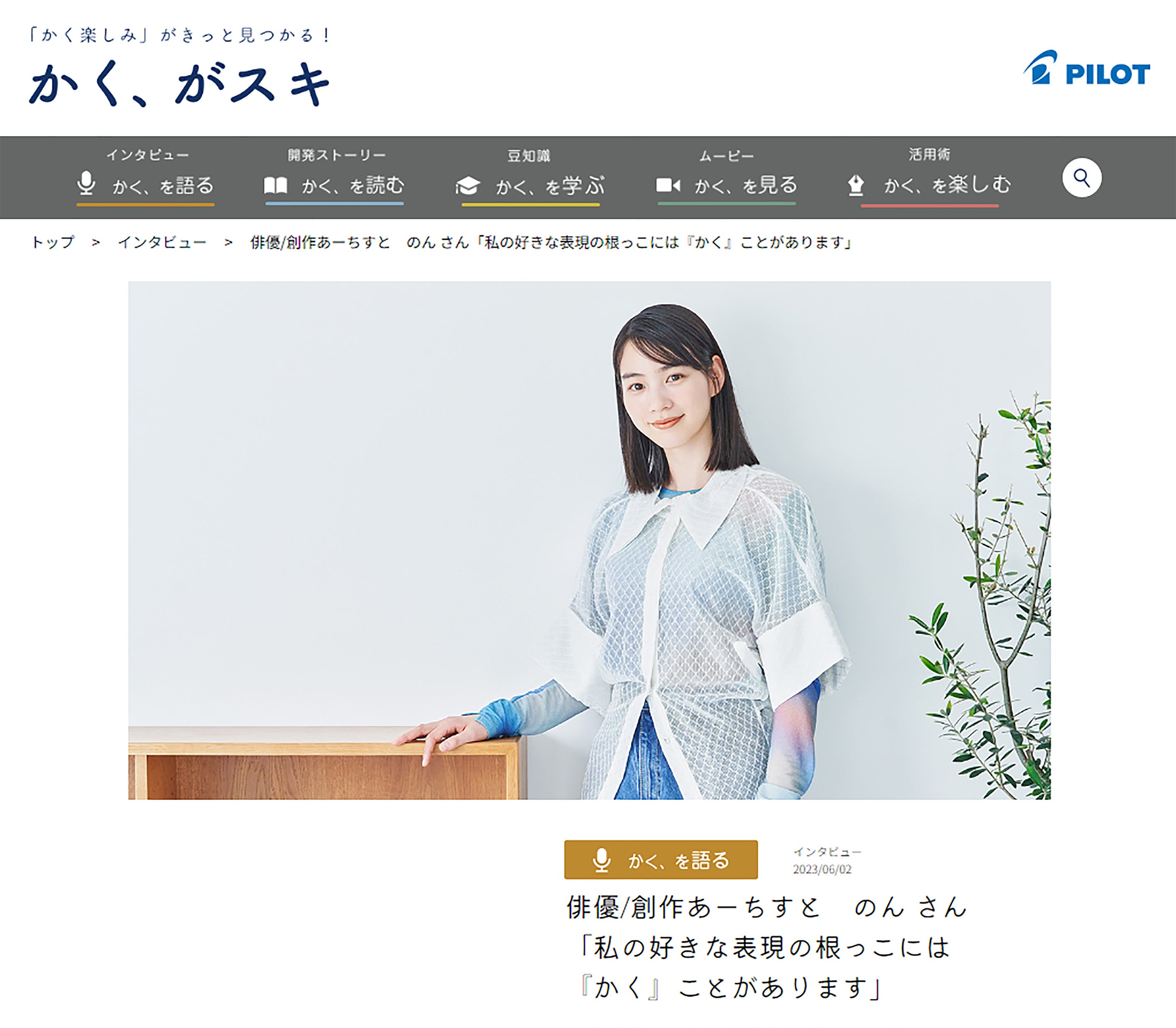 株式会社パイロットコーポレーション(社長:伊藤 秀)は、独自に運営するWEBメディア『かく、がスキ』において、俳優/“創作あーちすと”として活躍されるのんさんのインタビューを6月5日(月)より公開します。『かく、がスキ』は、「書く(描く)」ことの楽しさや手書きの魅力をお届けするWEBメディアで、「かく、を語る」「かく、を読む」「かく、を学ぶ」「かく、を見る」「かく、を楽しむ」の5つのカテゴリーにおいて、それぞれ独創的なコンテンツを発信しています。