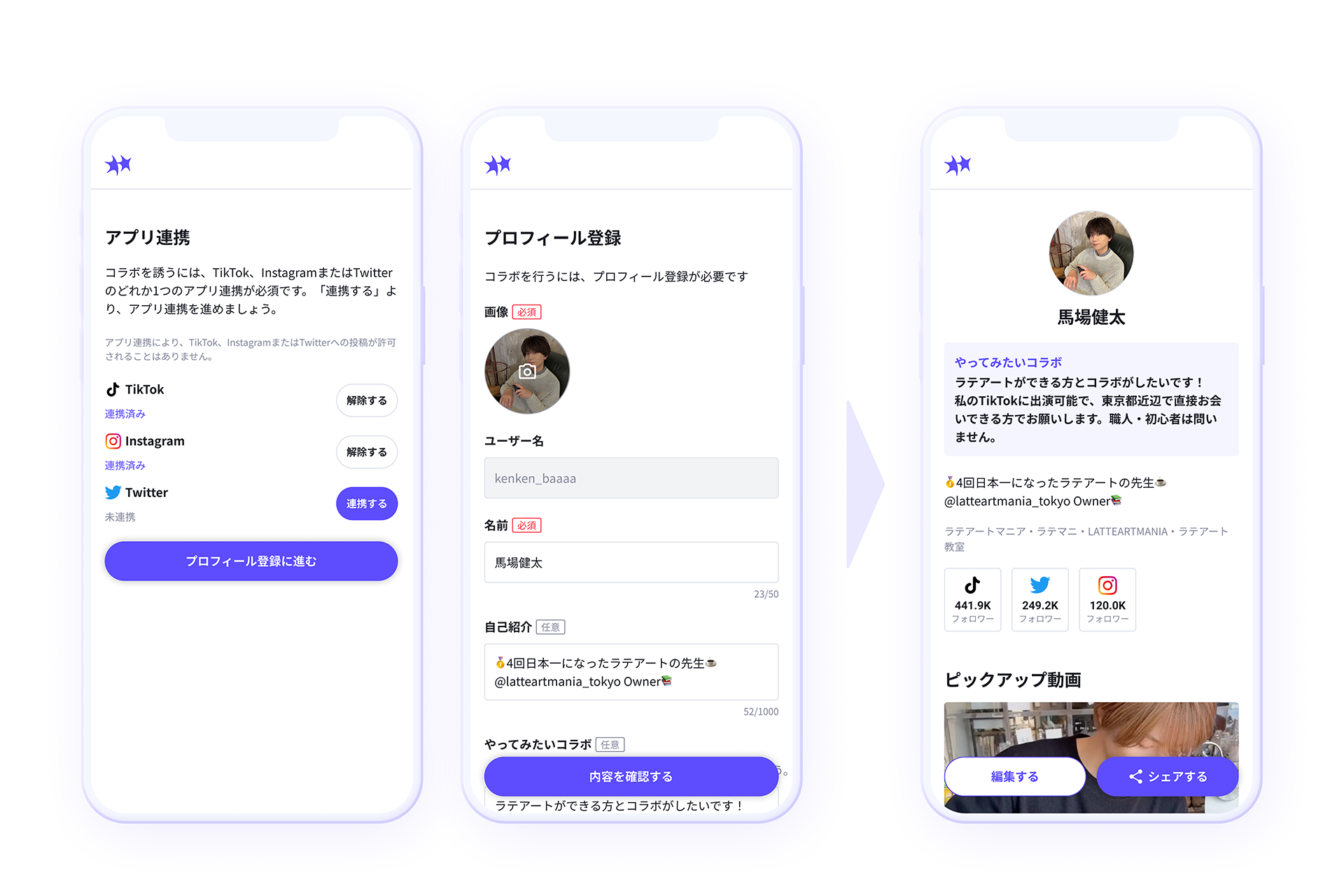 クリエイターページは、連携するSNS情報をもとに自動で入力されるため、簡単に登録・作成することができます。
