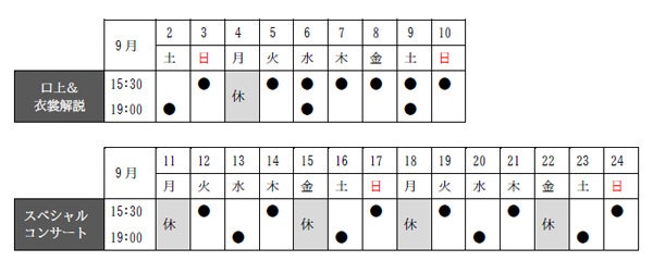 1週目(9月2日~10日)は、口上&衣裳解説を実施いたします。本人所有の貴重な衣裳を自ら纏い、解説を交えながら披露します。本公演で披露します衣裳はこの後、海外での展示が決定しています。日本ではしばらくの見納めとなる、大変貴重な機会になります。
