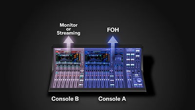 1台の『DM7』または『DM7 Compact』を2台の別々のミキサーのように機能させる「Split Mode」を新たに搭載しました。「Split Mode」を使うと、本来2台のミキサーが必要なFOH(メイン卓)とモニター、FOHと配信といった用途に際し、スペースの関係でミキサーが1台しか置けない場合にも、2台のミキサーがある環境と変わらないミキシングを可能にします。