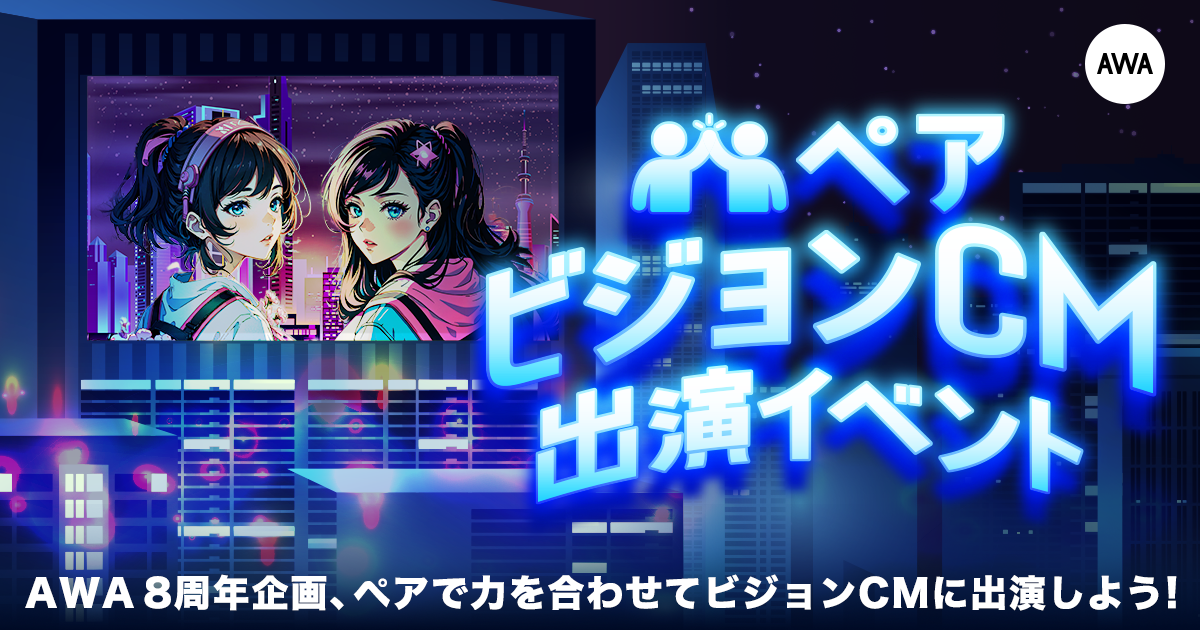エントリーが開始されたイベントは、AWAの8周年を記念して開催されるもので、AWAのイベントでは初となる配信者がペアで参加するイベントとなります。賞品として1位ペアには、都内屋外ビジョン&ABEMAで放映するAWAラウンジのCMに1週間ナレーション出演できる権利を進呈。また、2位のペアには、ABEMAで放映するAWAラウンジのCMに1週間ナレーション出演権が贈られます。本企画は、ペアであればトークをメインに活動する配信者、歌い手やVsingerなどの歌をメインに活動している配信者の方など、どなたでもご参加いただけますので、奮ってご参加ください。