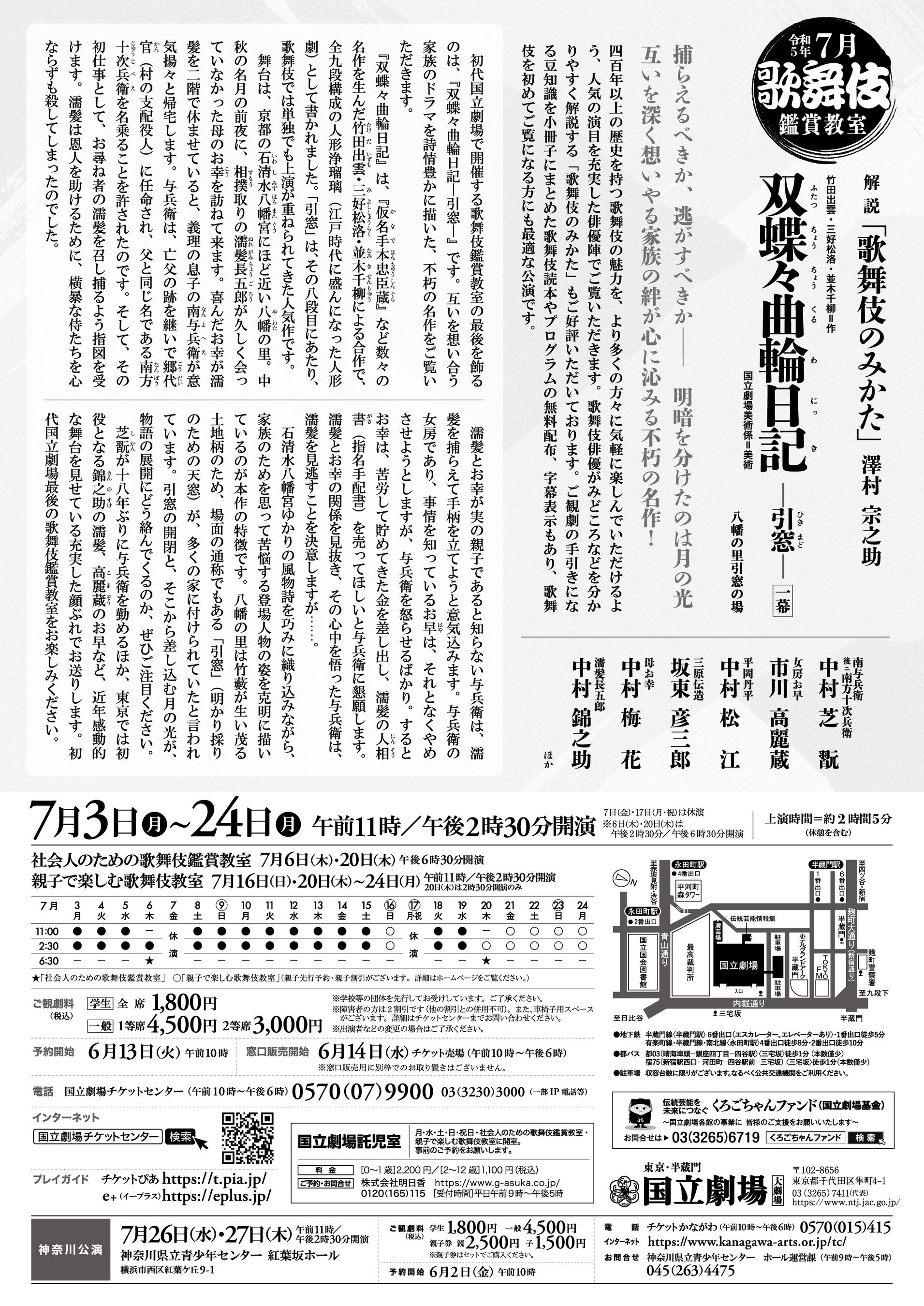 歌舞伎の入門公演として、半世紀以上にわたり延べ650万人を超える方が来場した歌舞伎鑑賞教室。今年10月末からの建て替えによる閉場を控え、初代国立劇場では見納めとなる7月歌舞伎鑑賞教室は、美しい月明かりの夜に仲睦まじい家族に起きた“事件”を情緒豊かに描いた名作を上演します。