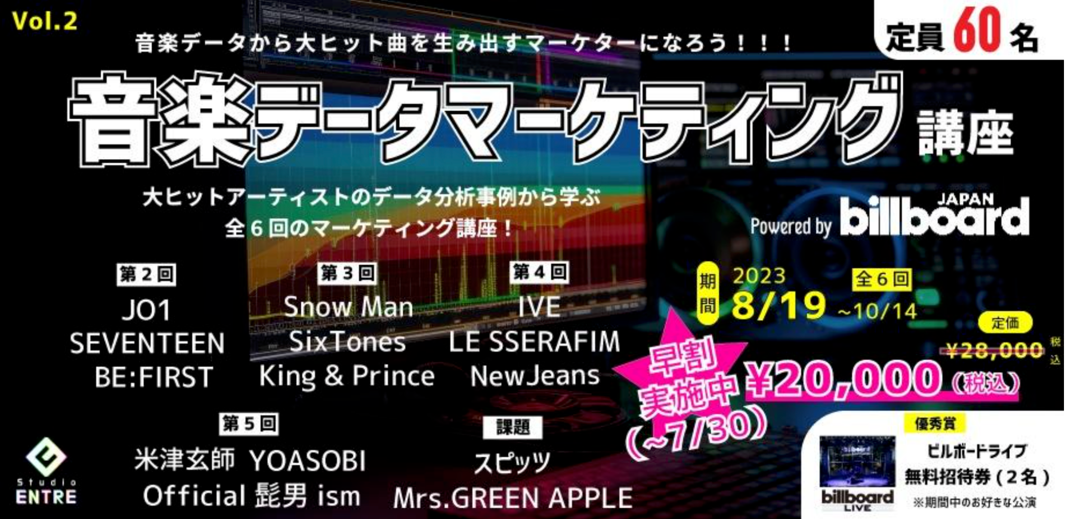 第2期音楽データマーケティング講座:https://entre-billboardjapan-datamarketing-202308.peatix.com