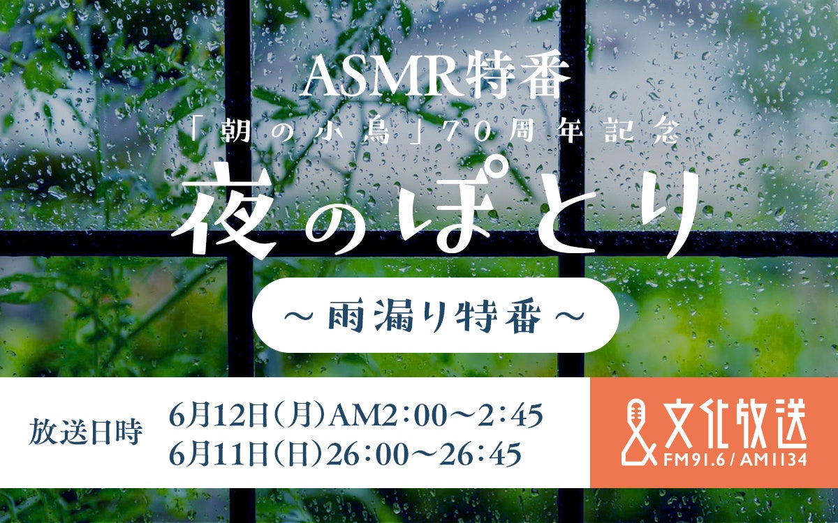 文化放送は、6月12日(月)午前2時00分~2時45分(6月11日(日)26時00分~26時45分)にASMR特番『夜のぽとり~雨漏り特番~』を放送します。当番組は、2019年から始まった高音質の音の魅力にフォーカスした長尺の“ASMR”特番シリーズで、今回で第22弾の放送となります。