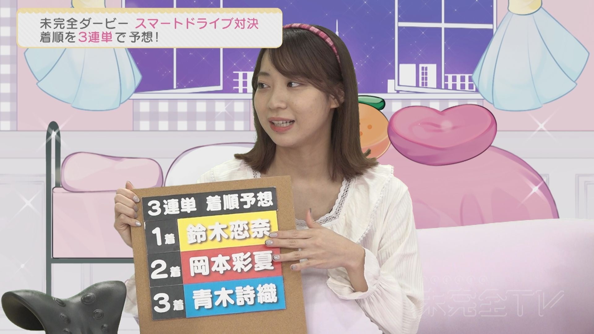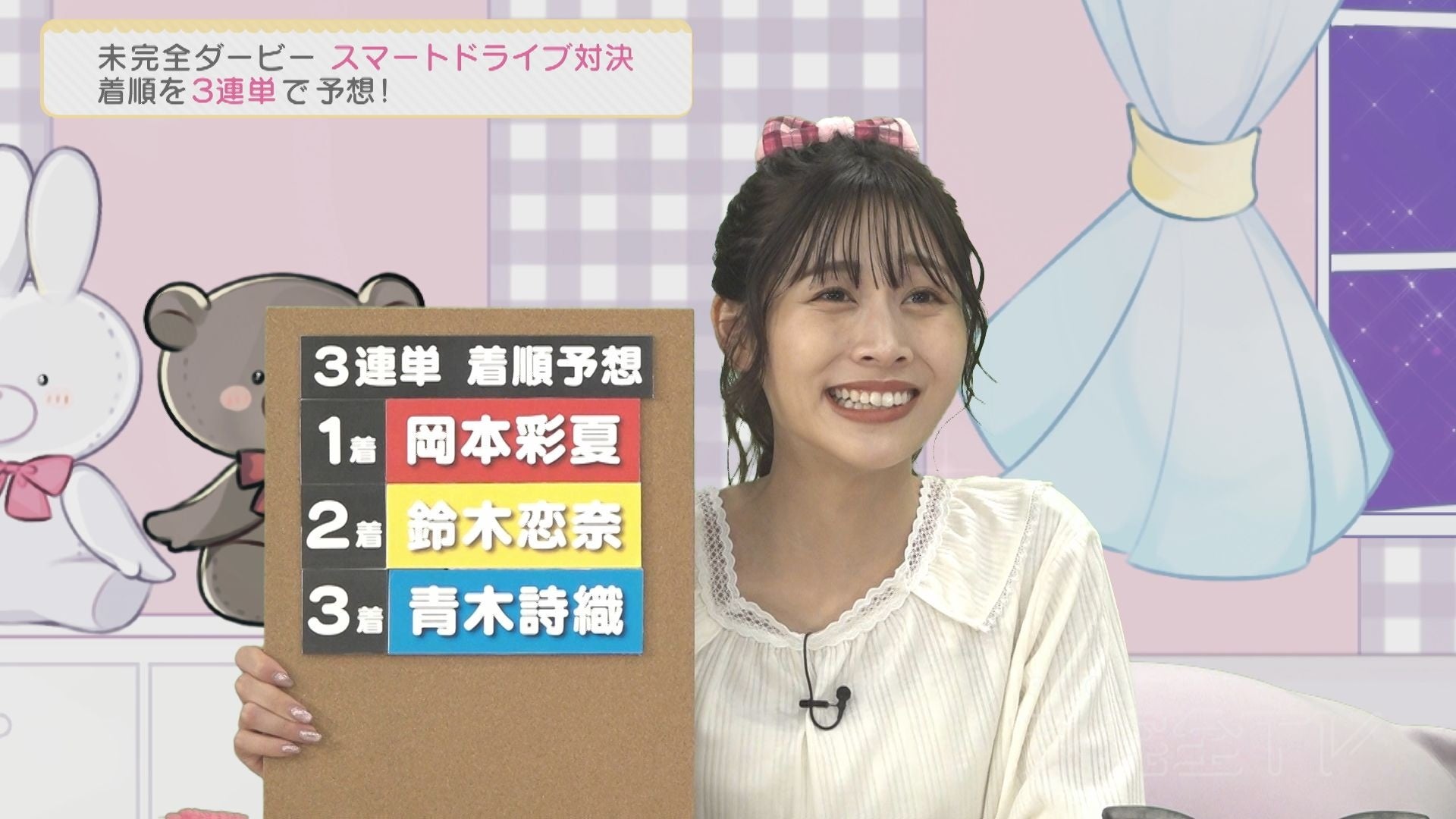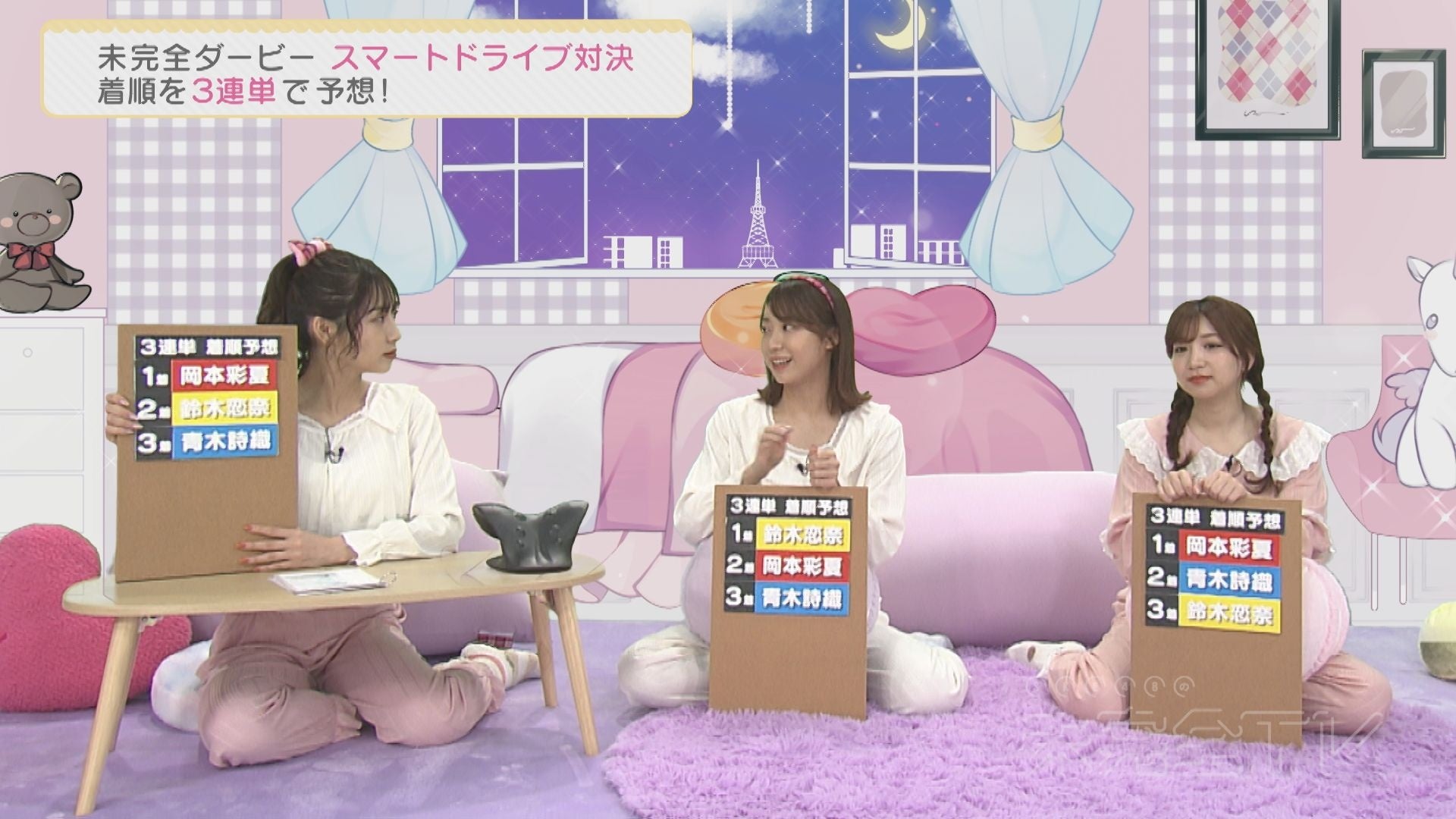 そんなロケVTRをスタジオで見守るのが日高優月(チームKⅡ)・太田彩夏(チームKⅡリーダー)・青海ひな乃(チームS)の3名。日曜深夜の就寝前をイメージしたパジャマ姿で、出走する3名の1着・2着・3着の着順3連単を予想する。