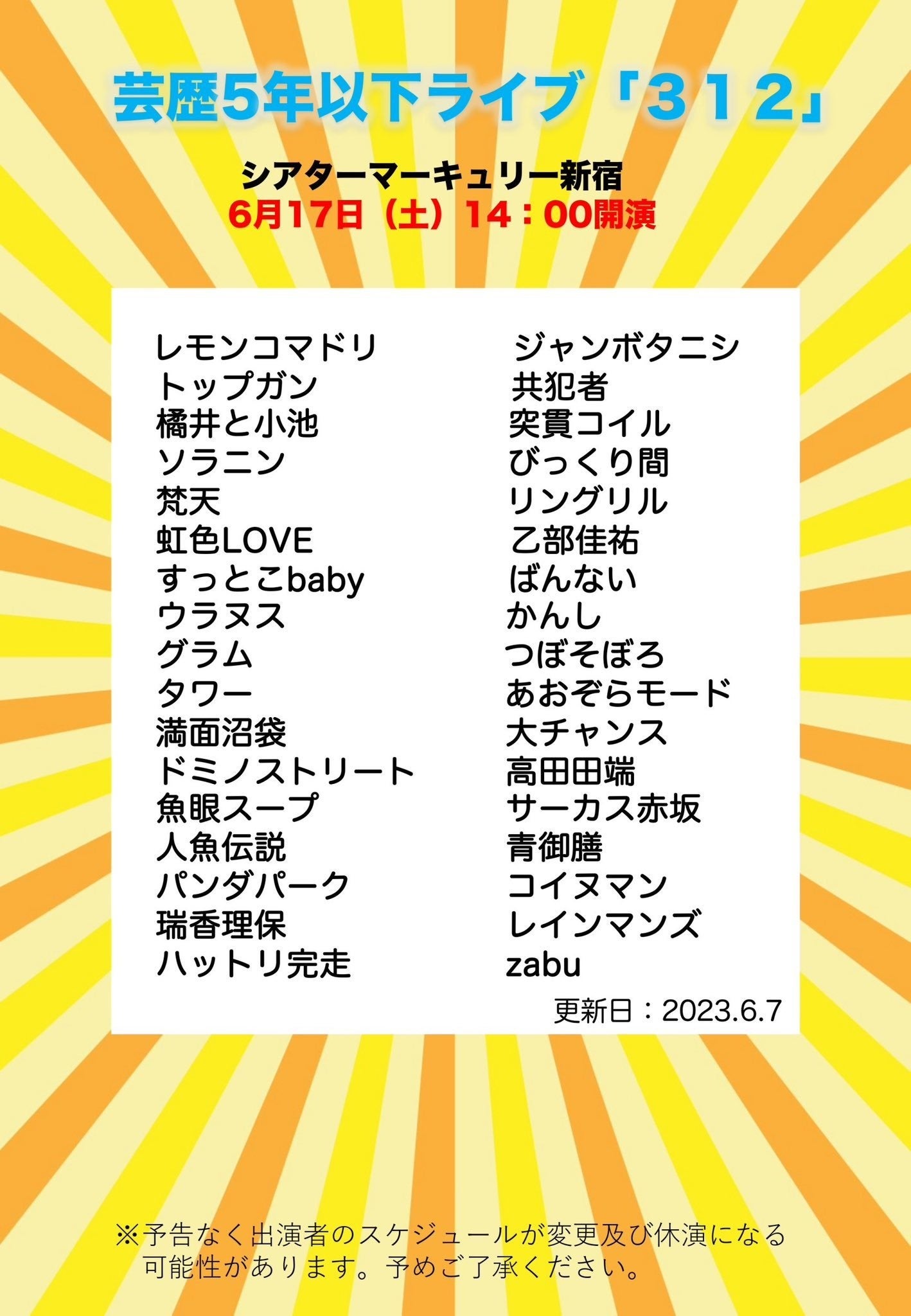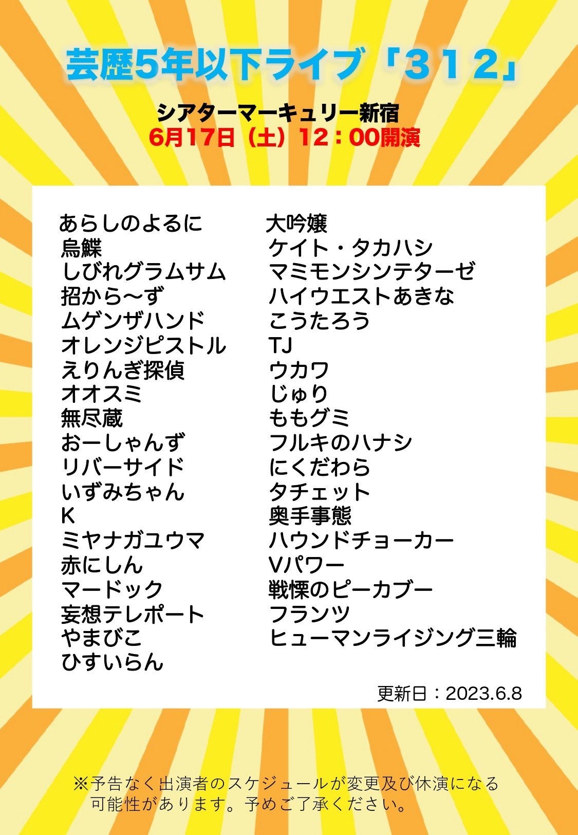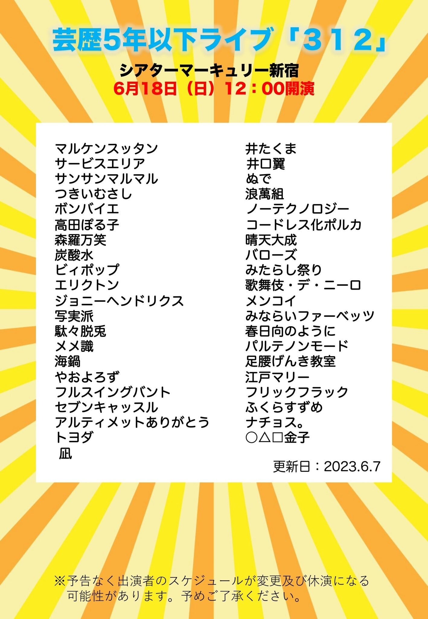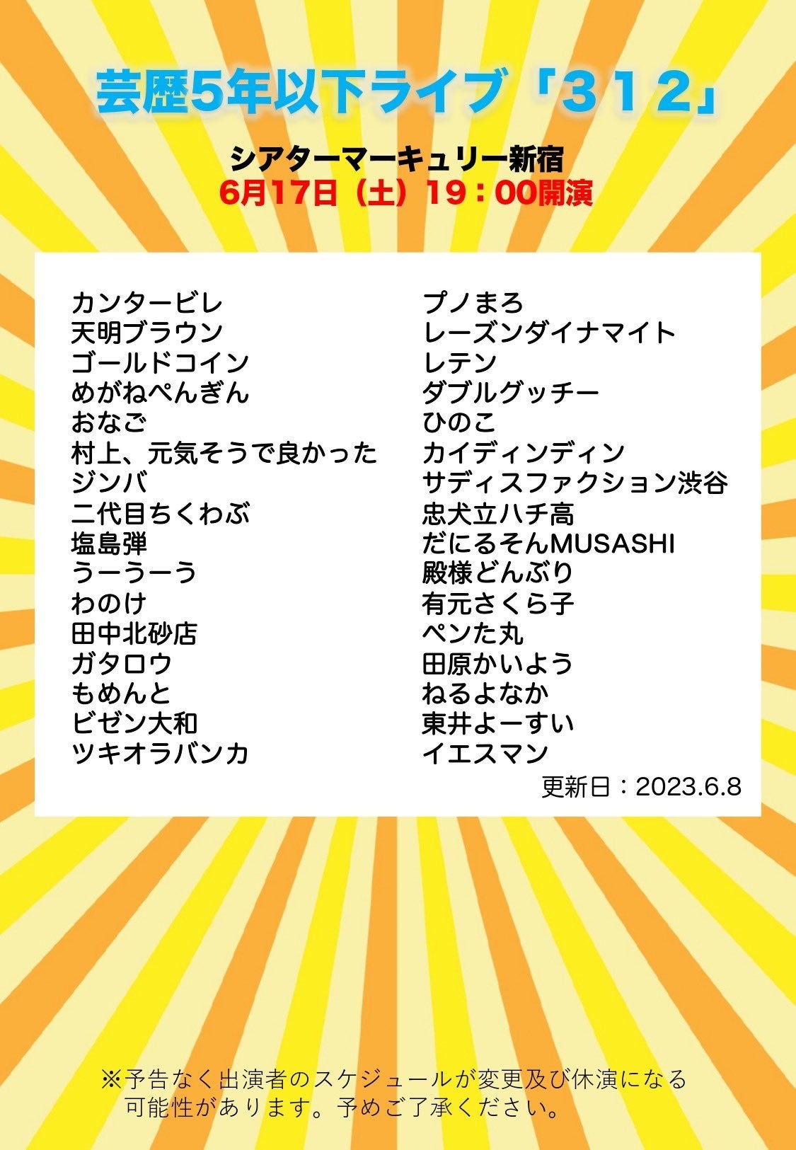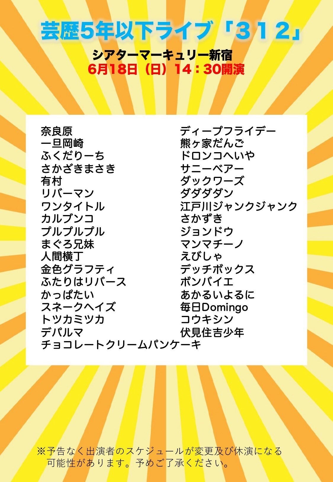 【シアターマーキュリー新宿】若手芸人によるお笑いライブ「312」開催