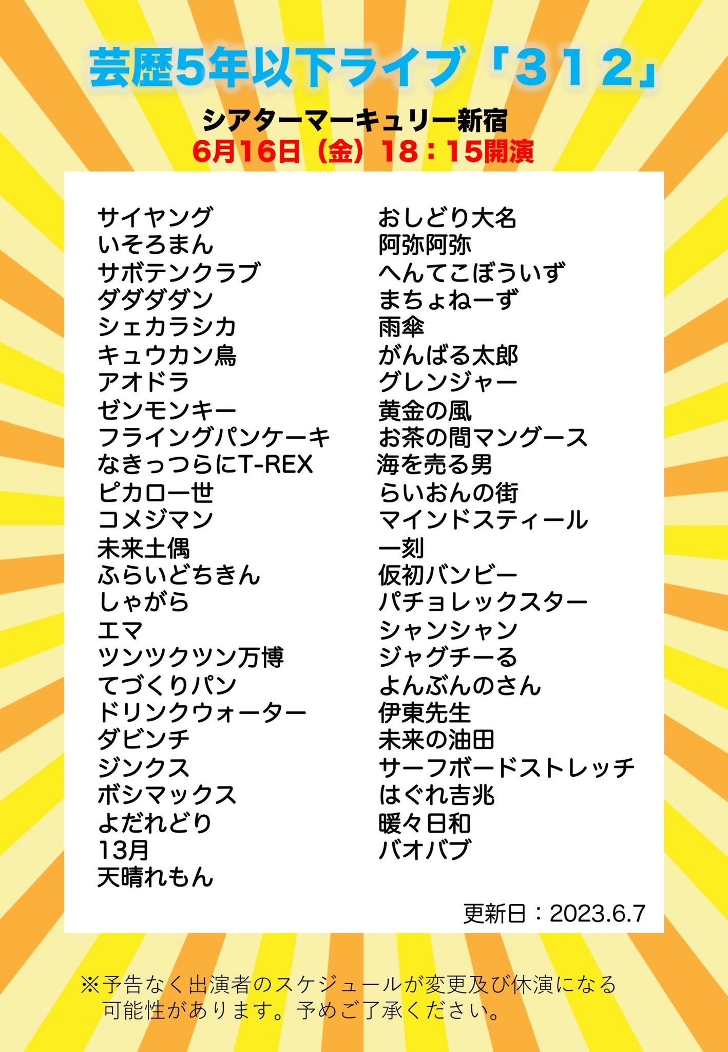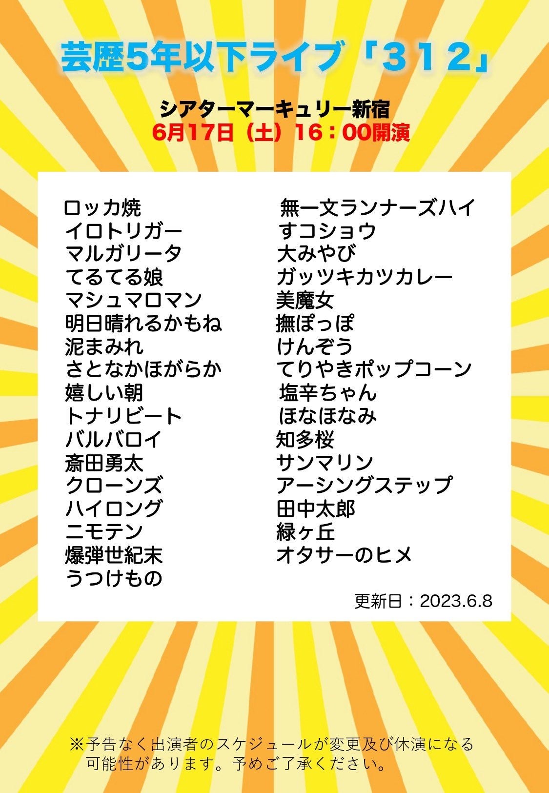 6月16日~18日の3日間、芸歴5年以下の若手芸人312組が出演するライブを開催いたしますのでお知らせいたします。