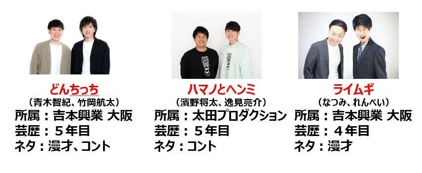 どんちっち(吉本興業)、ハマノとヘンミ(太田プロダクション)、ライムギ(吉本興業)※五十音順