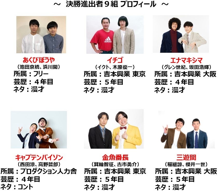 決勝進出者は、あくびぼうや(フリー・芸歴4年目)、イチゴ(吉本興業・芸歴5年目)、エナマキシマ(吉本興業・芸歴4年目)、キャプテンバイソン(プロダクション人力舎・芸歴4年目)、金魚番長(吉本興業・芸歴5年目)、 三遊間(吉本興業・芸歴5年目)、どんちっち(吉本興業・芸歴4年目)、ハマノとヘンミ(太田プロダクション・芸歴5年目)、ライムギ(吉本興業・芸歴4年目)です。