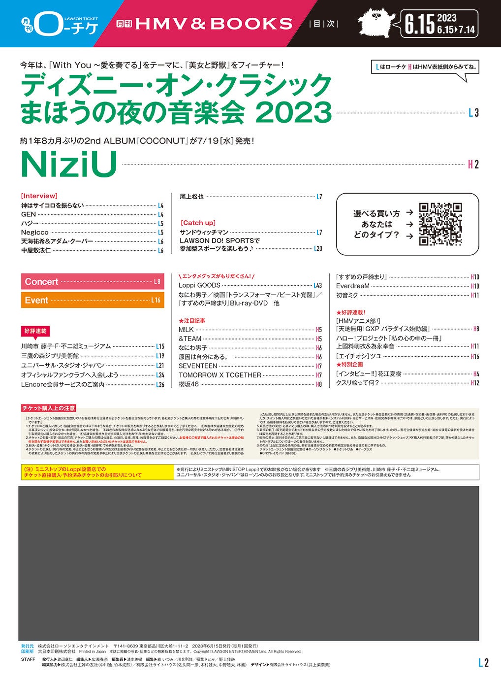 『月刊ローチケ』の表紙には、今年は「With You ~愛を奏でる」をテーマに開催する「ディズニー・オン・クラシック まほうの夜の音楽会 2023」。そして、『月刊HMV&BOOKS』の表紙には、約1年8ヶ月ぶりの2nd ALBUM『COCONUT』を7/19(水)に発売する「NiziU」が登場!