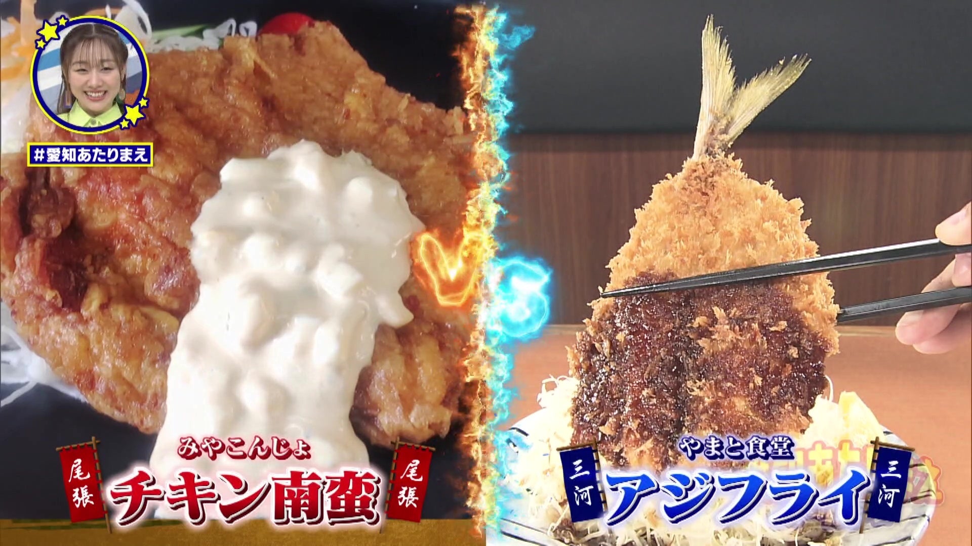 さらに、番組の人気コーナー「尾張vs三河ごちそうバトル」ではボリューム満点の揚げもの対決!宮崎を愛する店主が作り出すこだわり抜いた「超ジャンボチキン南蛮」をひっさげて戦いに挑むのは名古屋市千種区「みやこんじょ」。一方の三河からは、その日仕入れたピッチピチの新鮮な特大アジを使った超どデカいアジフライで豊橋市「やまと食堂」が勝負に挑みます。腹ペコ必至な大迫力の揚げもの対決、果たして勝利の栄冠を手にするのはどっち!?
