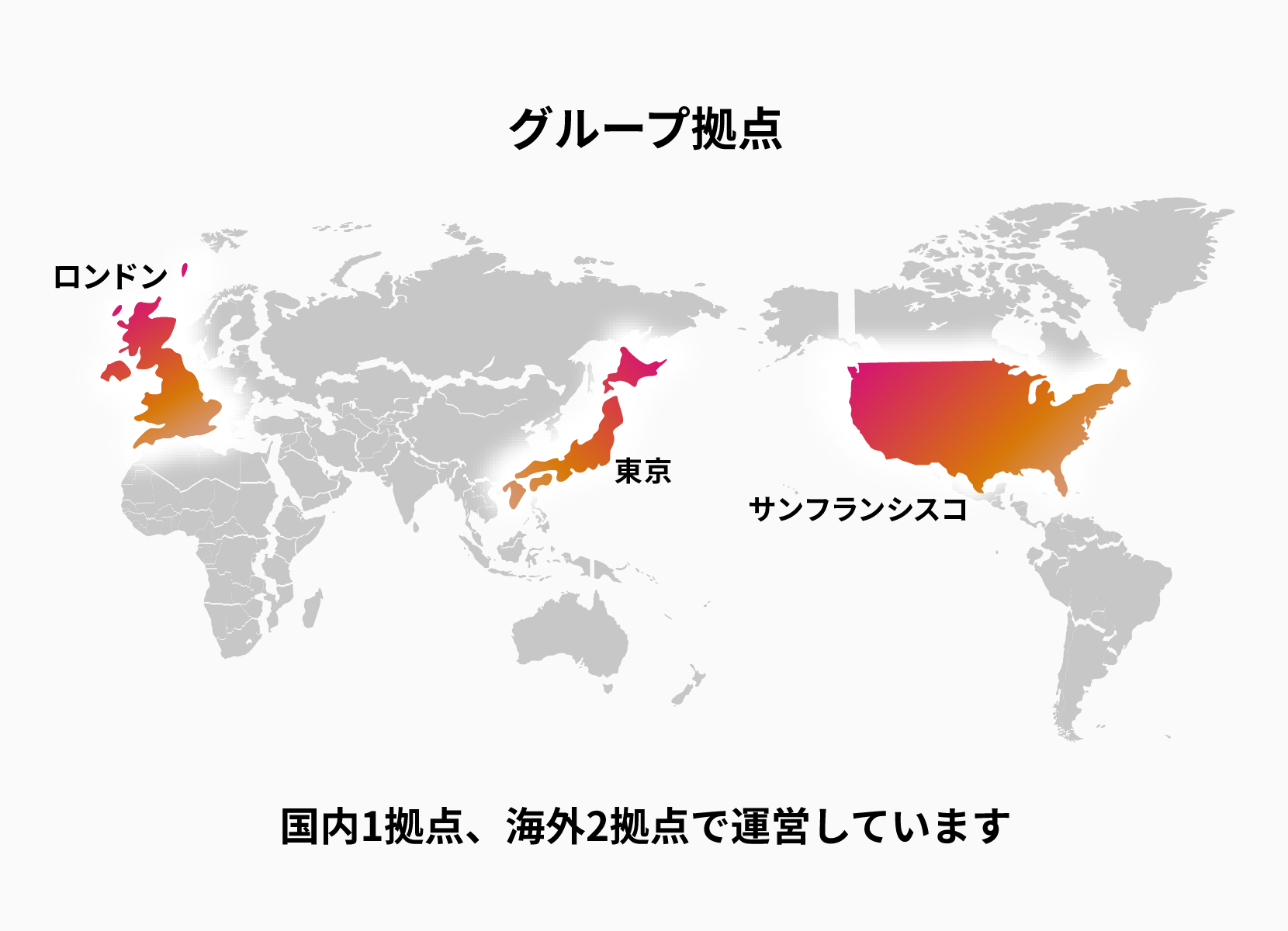 グローバルのニーズを受けて、日本(東京都港区)だけでなく米国(サンフランシスコ)と英国(ロンドン)にも拠点を設立いたしました。