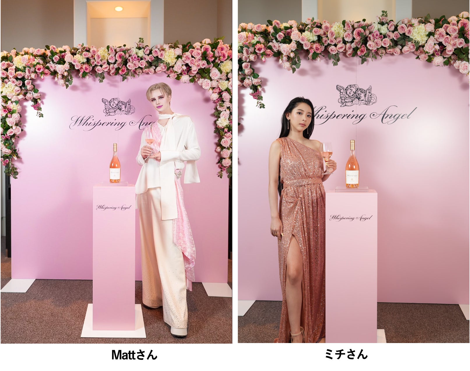 発売に先駆け、いち早く「ザ ペール」、「ウィスパリング エンジェル 2022 ヴィンテージ」をお披露目したペアリングディナーイベントを開催し、Mattさんやミチさんなどのセレブリティが来場しました。ペアリングディナーイベントでは、この日のために来日したシャトーデスクラン ブランドアンバサダーの ベンジャミン・スマジャ氏より、「ウィスパリング エンジェル 2022 ヴィンテージ」がお披露目され、会場となったアンダーズ 東京 ザ タヴァン グリル&ラウンジのペアリングディナーとともに振舞われました。「ザ ペール」と「ウィスパリング エンジェル 2022 ヴィンテージ」の世界観に合わせ、ディナー会場はピンク色の装飾で彩られました。