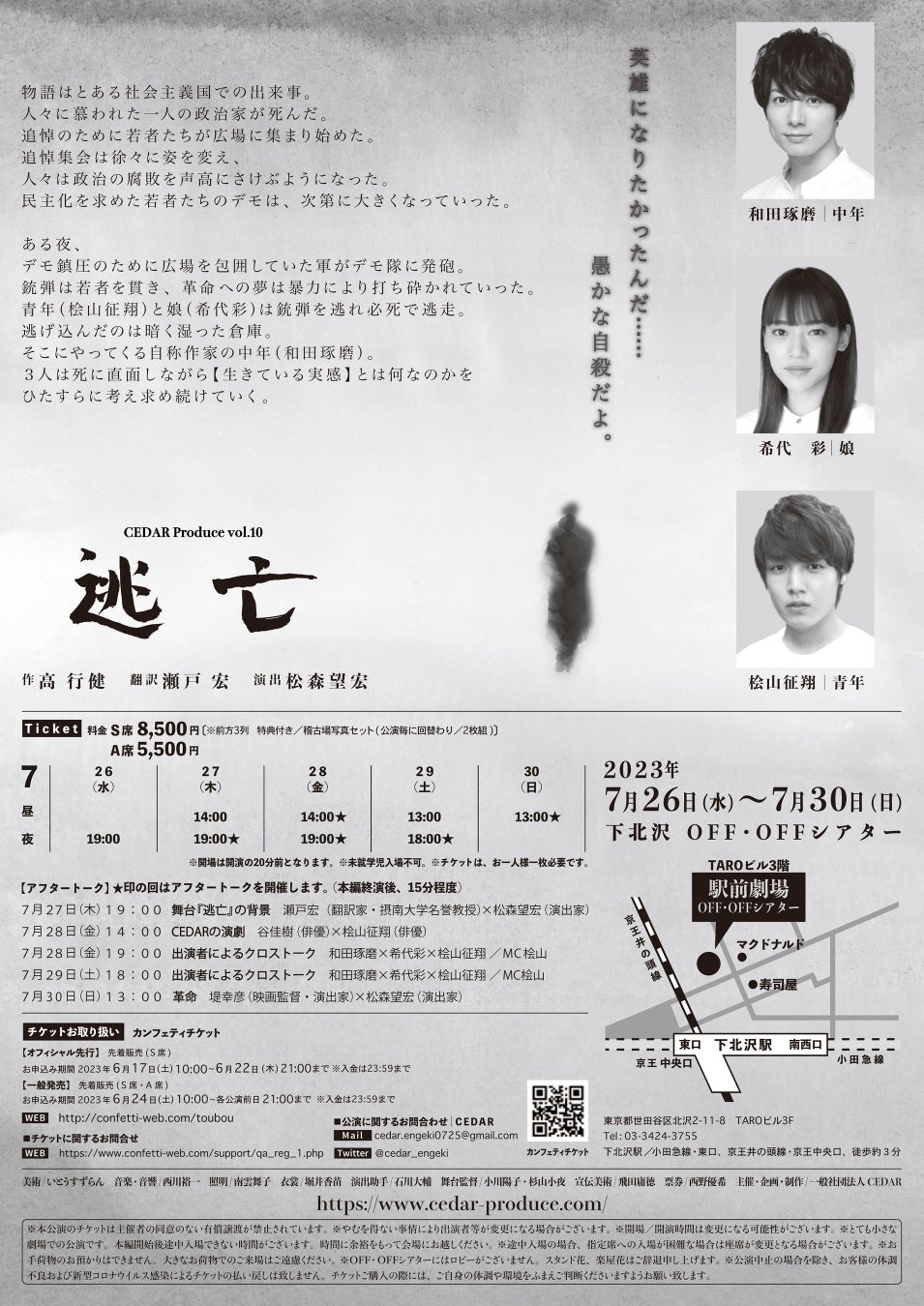 今回はアフタートークとして多彩なゲストにご登壇いただくこととなりました。7月27日(木)には本作の翻訳で摂南大学名誉教授の瀬戸宏さんが『逃亡』の背景と題して、演出家松森望宏と作品について熱く語ります。7月28日には第30回読売演劇大賞作品賞上半期ベスト5に選出された作品『わが友ヒットラー』でヒットラー役を演じた谷佳樹さんがCEDARの演劇について語ります。7月30日(日)には映画監督の堤幸彦さんが、自身の実体験も交え、1960年代から70年代の激動の時代を松森と語り合います。28日(金)、29日(土)には出演者によるクロストークもございます。ぜひご注目ください。