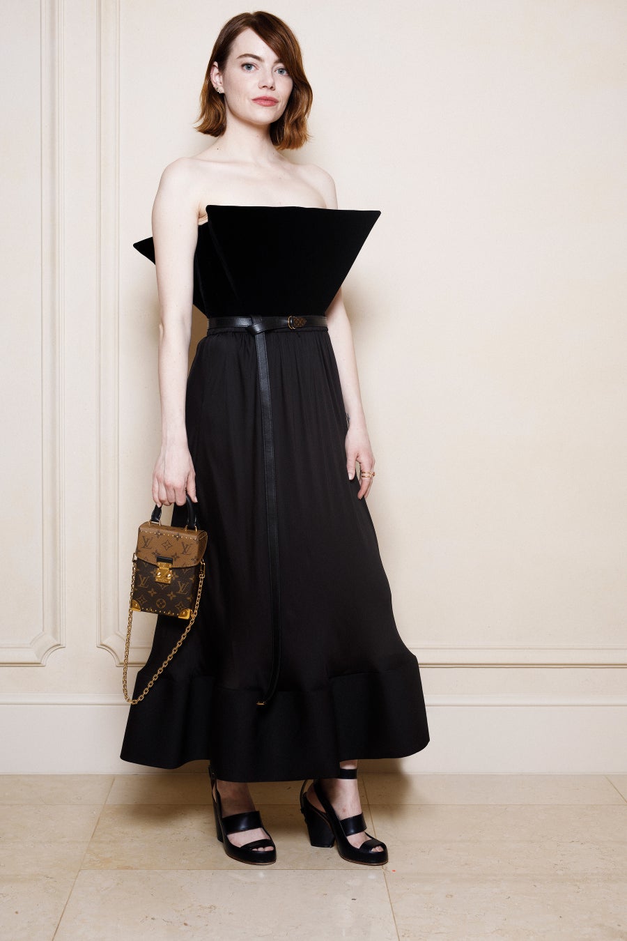 エマ·ストーンが、ルイ·ヴィトン2023年秋冬コレクションのルック39より、ブラックのシルクとベルベットの3Dビスチェドレスに、ブラックのレザーベルトを合わせ、ブラックレザーサンダルとモノグラムのカメラボックスで、ルックを完成させ、プライベートディナーに出席しました。