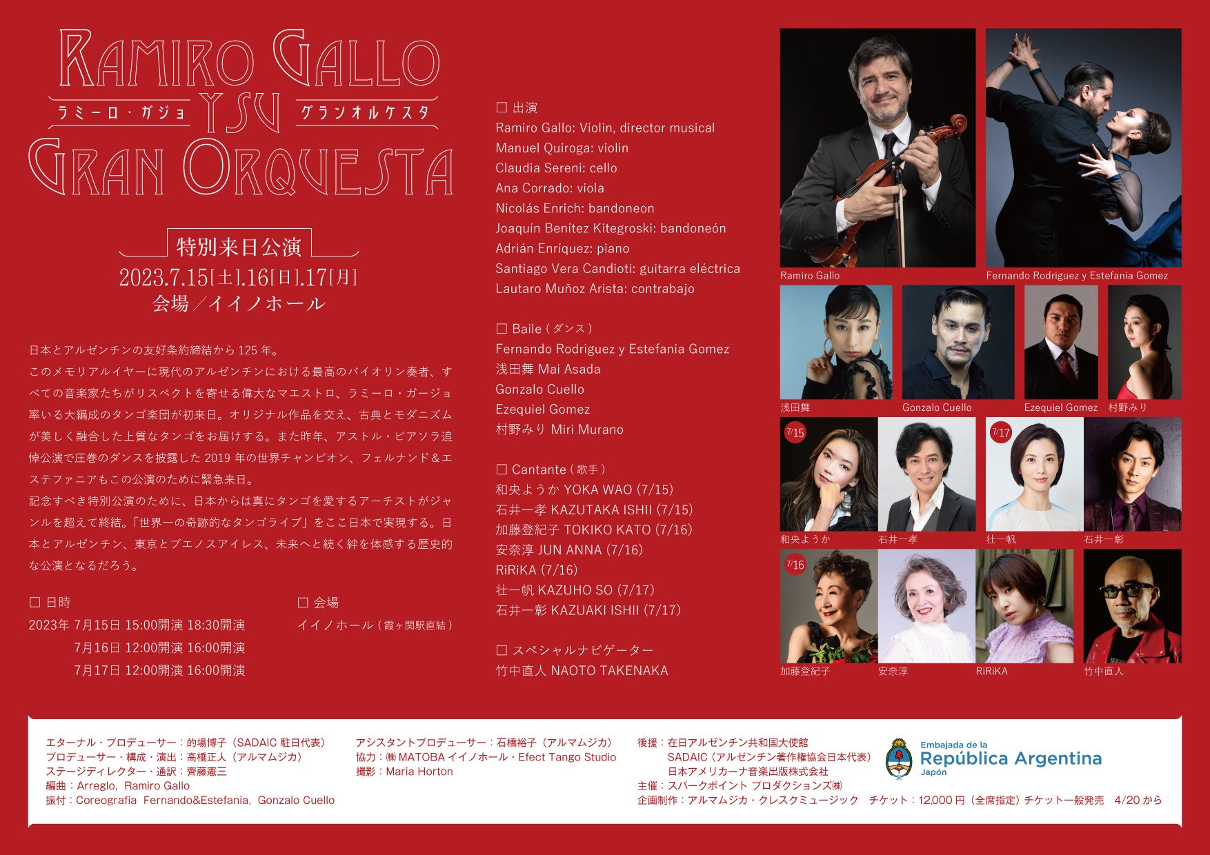 オリジナル作品を交え、古典とモダニズムが美しく融合した上質なタンゴをお届けする。また昨年、アストル・ピアソラ追悼公演で圧巻のダンスを披露した2019年の世界チャンピオン、フェルナンド&エステファニアもこの公演のために緊急来日。 記念すべき特別公演のために、日本からは真にタンゴを愛するアーチストがジャンルを超えて終結。「世界一の奇跡的なタンゴライブ」をここ日本で実現する。日本とアルゼンチン、東京とブエノスアイレス、未来へと続く絆を体感する歴史的な公演となるだろう。