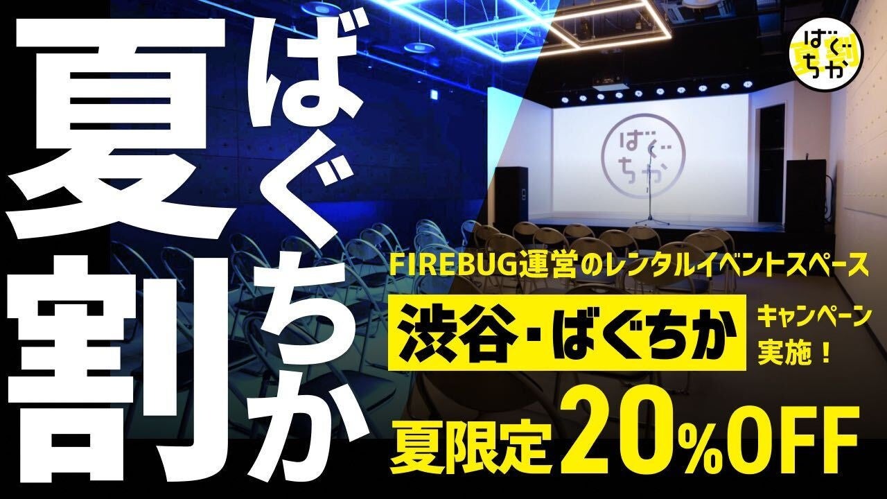 株式会社FIREBUG(本社:東京都渋谷区、代表取締役 CEO:佐藤詳悟、代表取締役 CIO/CFO:宮崎聡、以下当社)はこの度、当社が運営するレンタルイベントスペース「ばぐちか」をお得に利用いただける夏限定のキャンペーンを実施することをお知らせいたします。