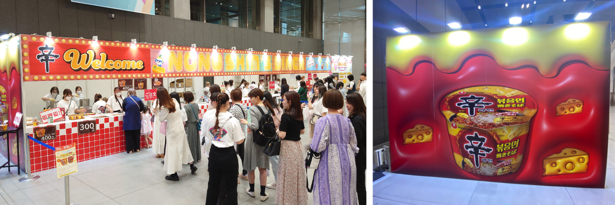 辛ラーメンシリーズの新商品「辛ラーメン焼きそば チーズ カップ」が世界最速で試せたり、韓国スナック菓子のアレンジスイーツが楽しめるフードコーナーも展開しました。2日間で1,000食が完売となり、韓国グルメを堪能していただきました。