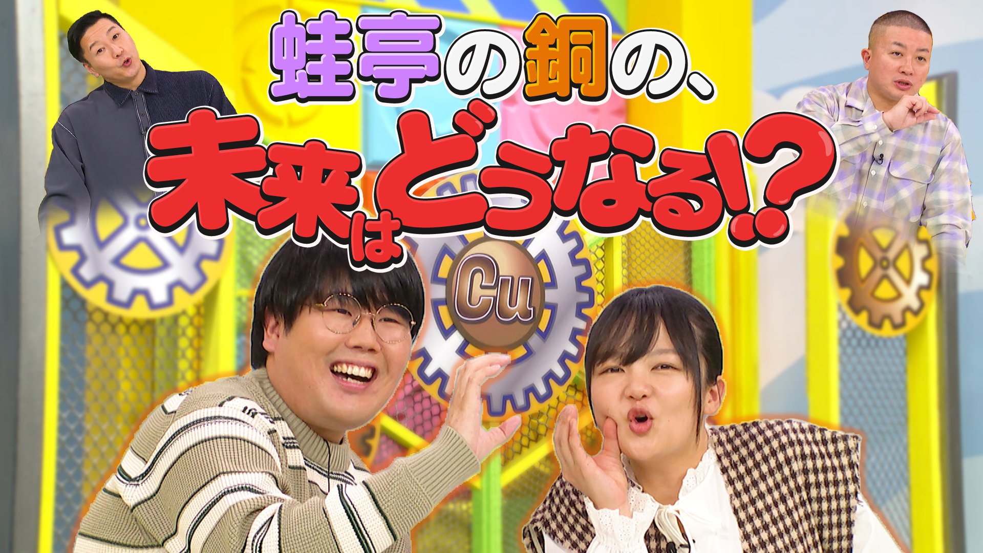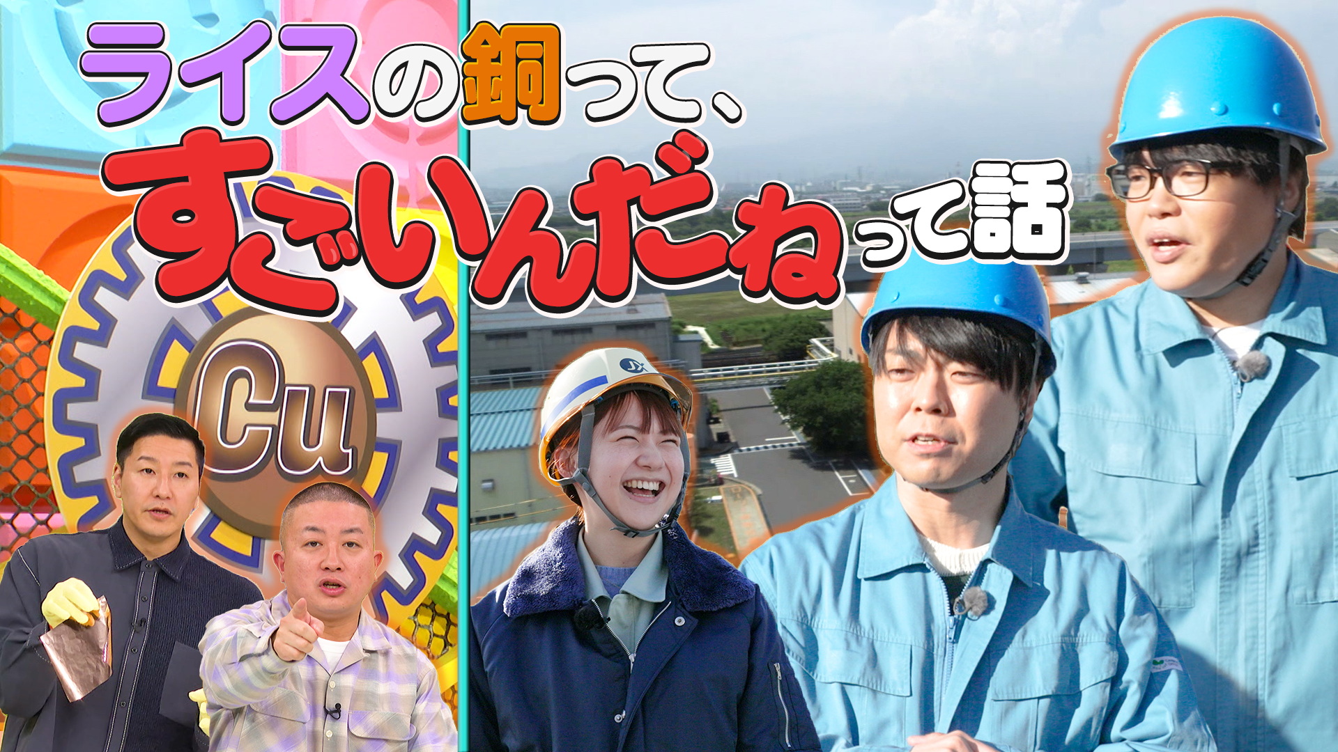 【内容】 クイズバラエティやロケ取材といった形式で、チョコレートプラネット、ライス、蛙亭と一緒に、銅の特性から製錬方法、デジタル社会を支える銅素材のすごさ、資源循環の重要性など、銅に関する幅広い知識を楽しみながら学ぶ。