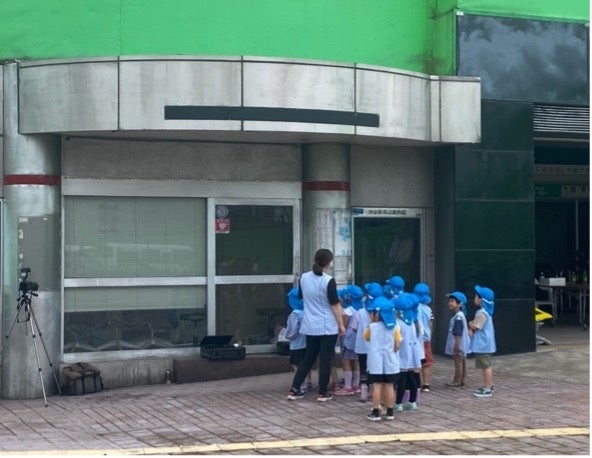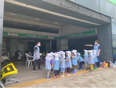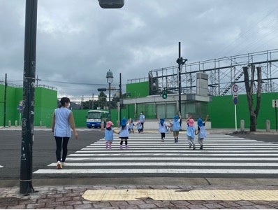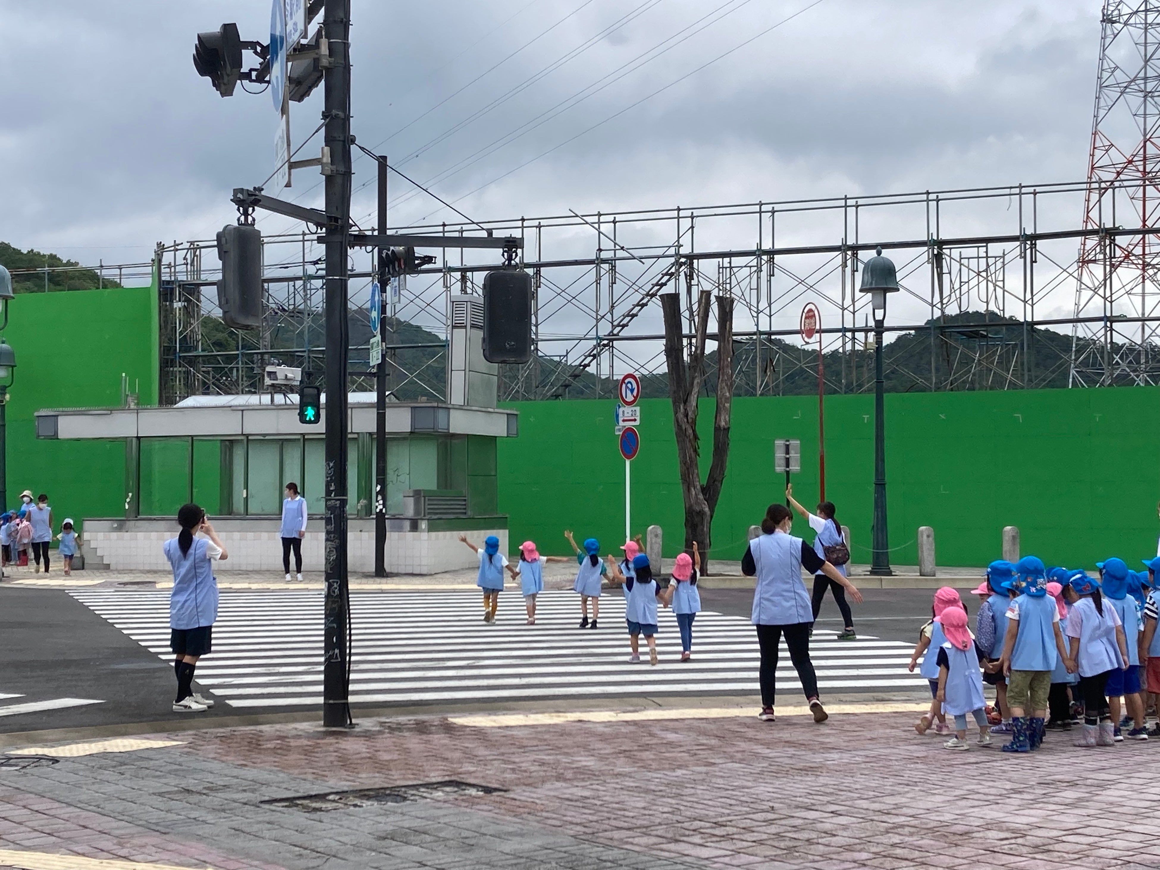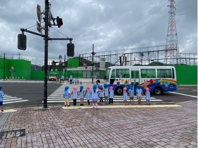 スタジオ内に幼稚園バスを乗り入れて、園児たちに信号機の意味や横断歩道の渡り方などを指導、横断の練習が行われました。安全教室終了後には、スタジオ内の見学、記念撮影が行われ大盛況のイベントとなりました。