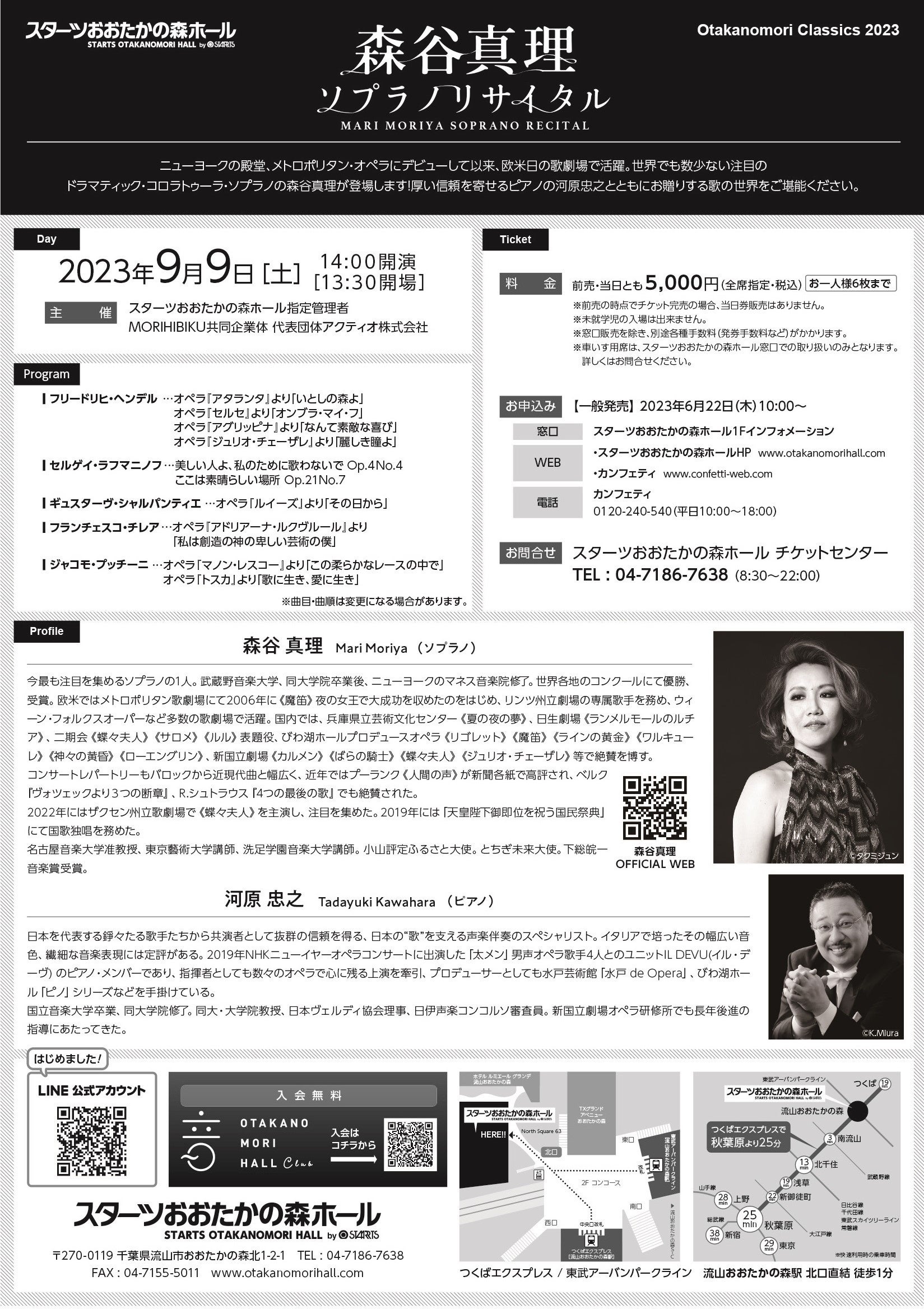 ニューヨークの殿堂、メトロポリタン・オペラにデビューして以来、欧米日の歌劇場で活躍。世界でも数少ない注目のドラマティック・コロラトゥーラ・ソプラノの森谷真理が登場します!厚い信頼を寄せるピアノの河原忠之とともにお贈りする歌の世界をご堪能ください。