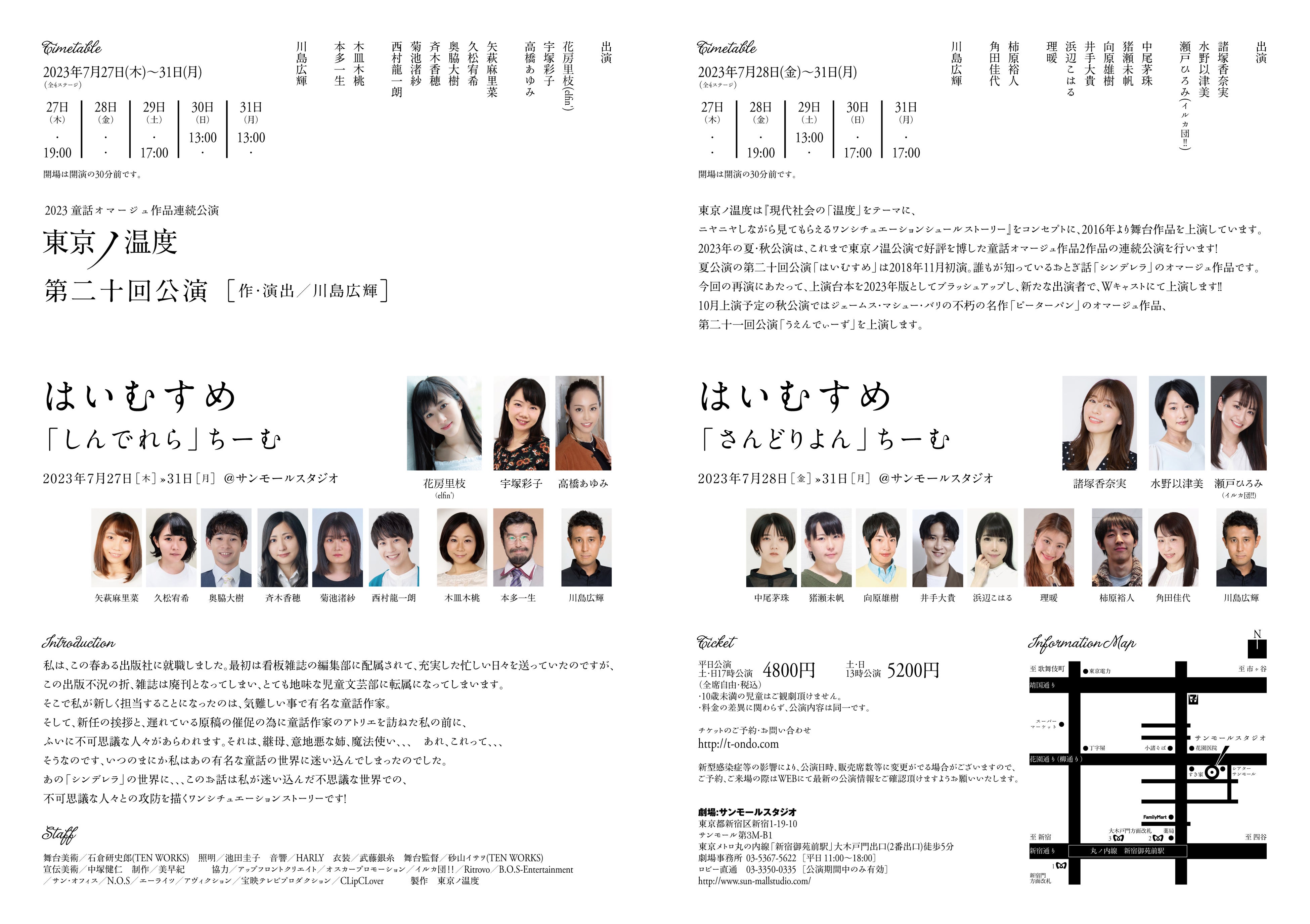 第二十回公演『はいむすめ』は「シンデレラ」のオマージュ作品。花房里枝(elfin’)、諸塚香奈実がW主演し、第二十一回公演『うえんでぃーず』は「ピーターパン」のオマージュ作品。後藤夕貴が主演し、稲葉貴子が出演します。
