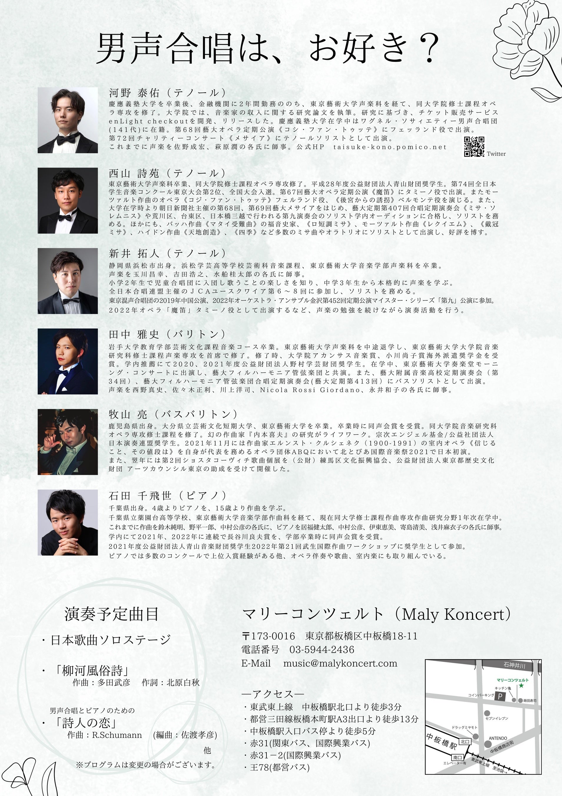 東京藝術大学出身の声楽家・ピアニストによる、男声合唱を取り上げた少人数アンサンブルコンサート。第1部では日本歌曲のソロステージ、第2部では男声合唱定番の多田武彦から、シューマンの代表作「詩人の恋」を少人数アンサンブルでお届けします。少人数ならではのハーモニーを是非お聞きください。