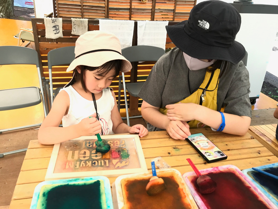 LuckyFesが切り抜かれたシートにインクをつけたスタンプを押していき色をつけて行きます。文字全てに色をつける事が出来たらシートを剥がし、周りにクレヨンやスタンプで自由にアレンジしてみましょう。