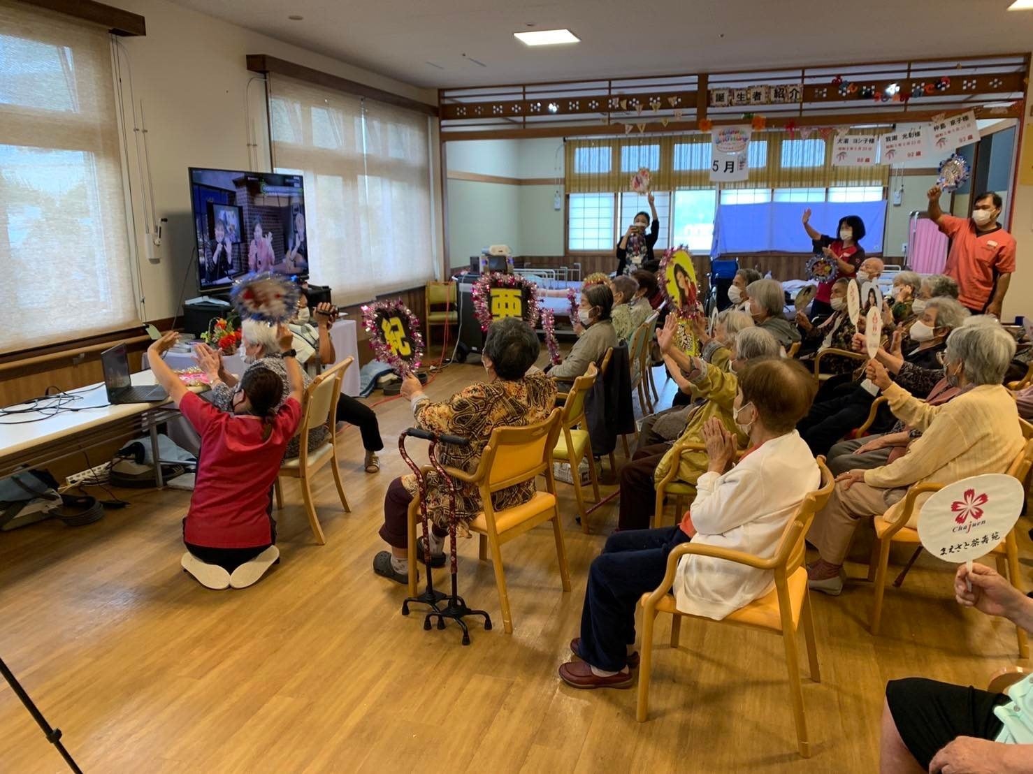 施設から送られて来たぬり絵作品の表彰や、ヒット曲を参加者と共に歌と踊りを楽しんだり、八代亜紀氏がハッピーバースデーを歌って誕生日も祝う。