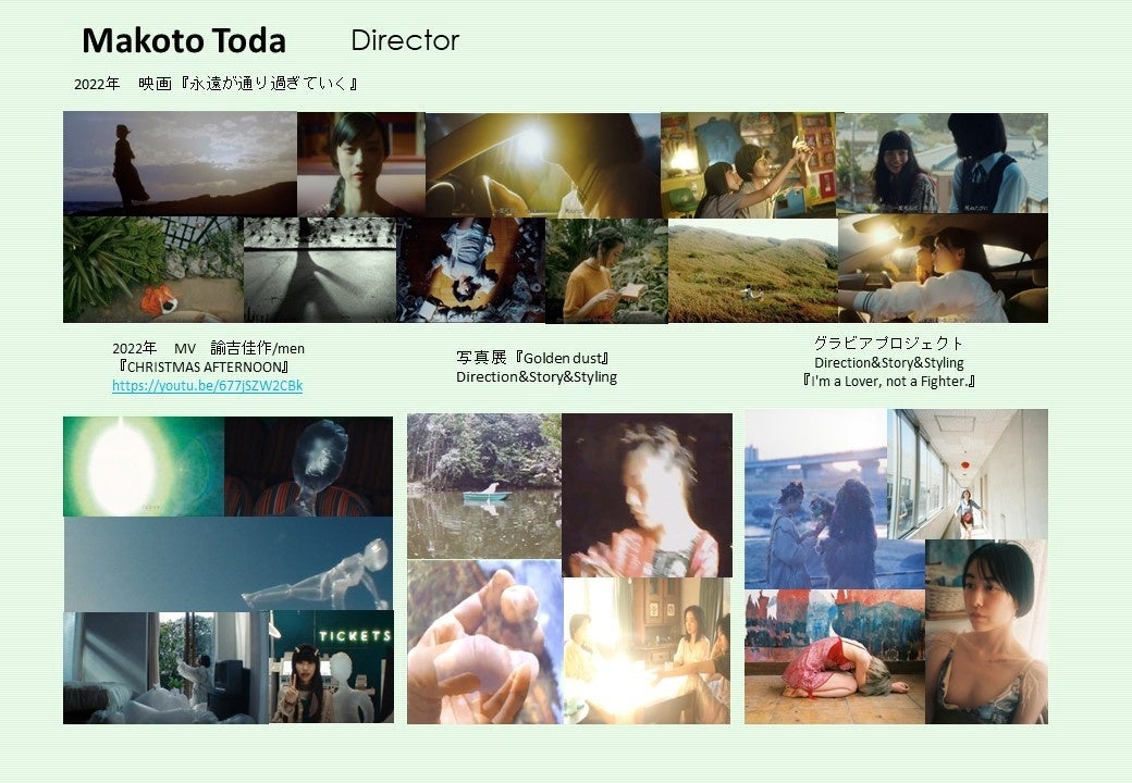初監督を務めた長編映画『永遠が通り過ぎていく』は1年間の自主配給が話題を呼び全国ロードショー。大森靖子『M』、諭吉佳作/men『CHRISTMAS AFTERNOON』などミュージックビデオの監督も務める。