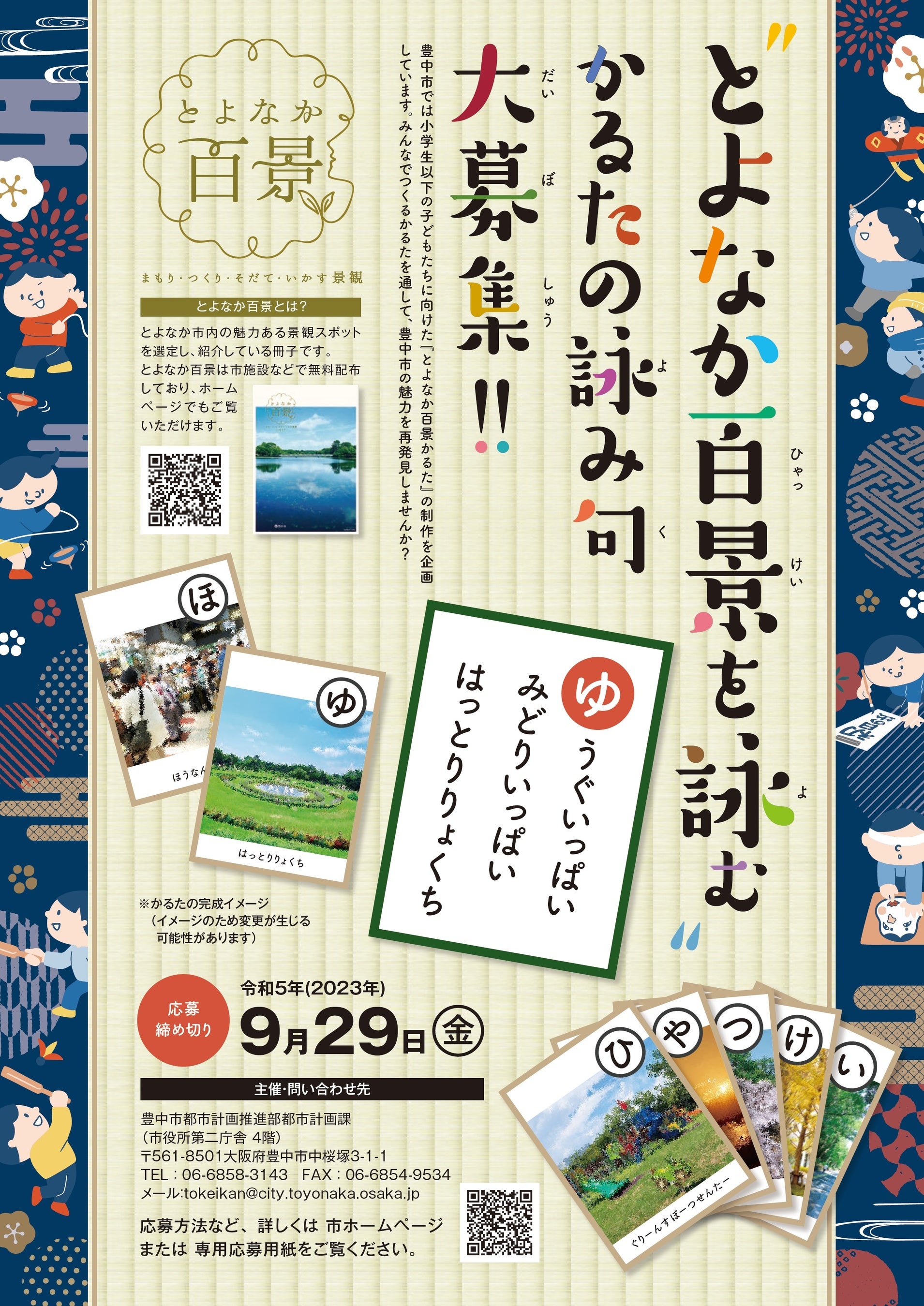豊中市は、小学生以下の子どもたちに楽しく学びながら市の魅力を再発見してもらうため、「とよなか百景かるた」を制作します。同かるたの制作にあたり、とよなか百景の各スポットの写真を絵札とした詠み句を50句募集します。
