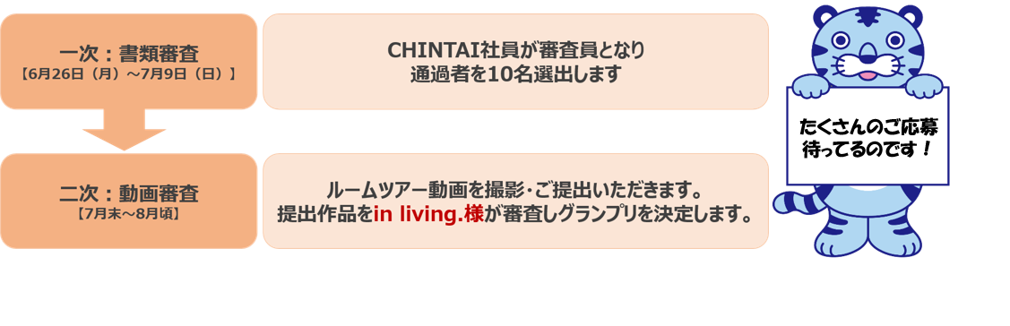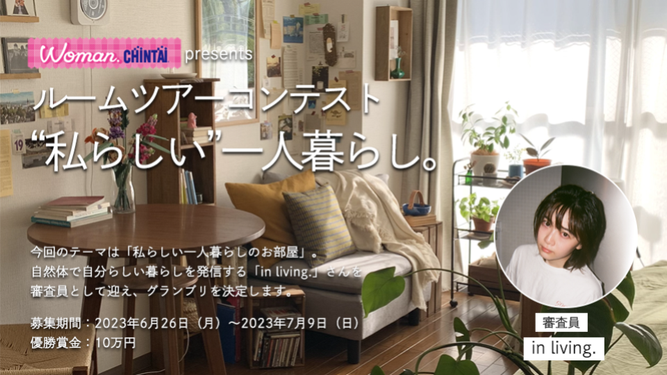 Woman.CHINTAIルームツアー(https://www.youtube.com/c/Womanchannel)では、一人暮らし女性を中心にインテリアから物件の設備・家賃などの「暮らしのリアル」な情報まで、“憧れ×リアル”を掛け合わせたお部屋をルームツアー形式で紹介しています。今回のルームツアーコンテストでは、「私らしい一人暮らしのお部屋」をテーマに、一人暮らしだからこそできる自分だけの空間づくりや好きな物に囲まれたお部屋を一般募集いたします。審査員には、自然体で自分らしい暮らしを発信するin living.様を招き、グランプリを決定します。グランプリの方には賞金10万円を贈呈いたします。皆様からのご応募お待ちしております。