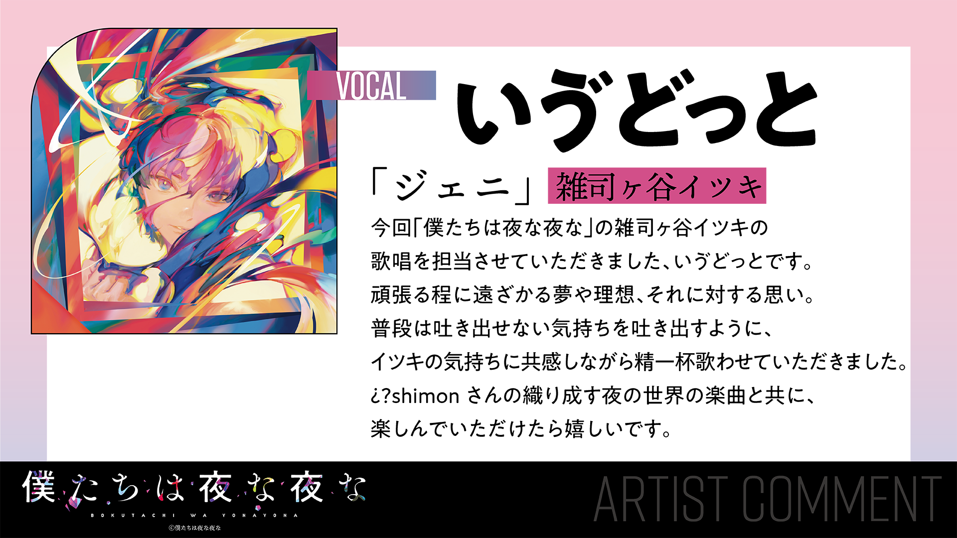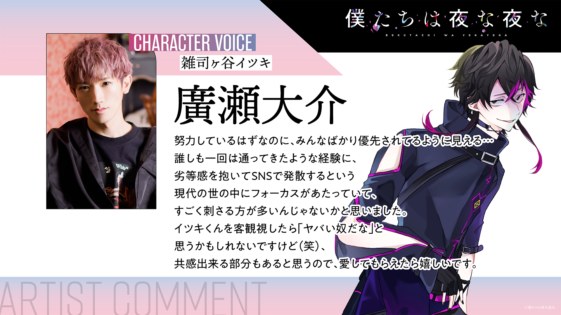 本当の自分を解放する共感性ドラマコンテンツ『僕たちは夜な夜な』(通称『僕よな』)。キャラクターが抱えている「苦悩」を声優ボイス付きショート動画で吐露し、ボカロP×歌い手によって「感情」が歌になる今作!