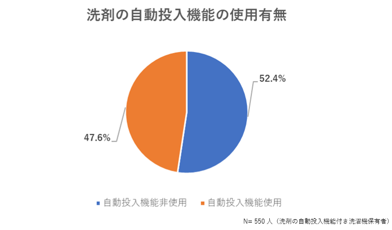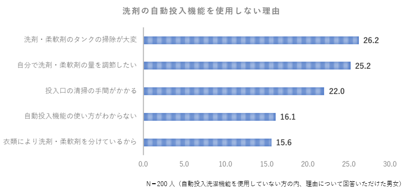 ライオンが行った調査のデータによると、「洗剤の自動投入機能付き洗濯機」を持ちながら、自動投入機能を使用していない人が半数を超える52.4%にも上ることが判明しました。また、機能を使用していない方にその理由を聞いた所、「洗剤・柔軟剤のタンクの掃除が大変(26.2%)」「自分で洗剤・柔軟剤の量を調節したい(25.2%)」「投入口の清掃の手間がかかる(22.0%)」がトップ3となり、「量の調節」と「清掃・掃除」が要因として上位に上がりました。