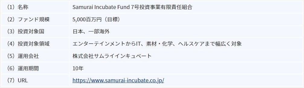 この投資戦略の考えのもと、当社は株式会社サムライインキュベート(本社:東京都港区、代表取締役:榊原 健太郎、以下「サムライインキュベート社」)が、組成したファンド「Samurai Incubate Fund 7号投資事業有限責任組合」(以下「本ファンド」)に出資したことをお知らせいたします。