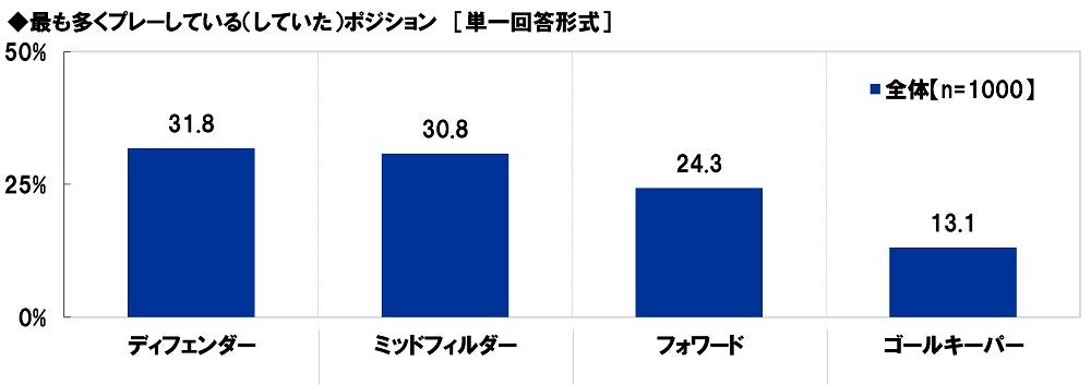 また、最も多くプレーしている(していた)ポジションを聞いたところ、「ディフェンダー」(31.8%)と「ミッドフィルダー」(30.8%)が特に高くなり、「フォワード」(24.3%)、「ゴールキーパー」(13.1%)と続きました。