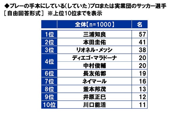 全回答者(1,000名)に、プレーの手本にしている(していた)プロまたは実業団のサッカー選手を聞いたところ、1位「三浦知良」(57名)、2位「本田圭佑」(41名)、3位「リオネル・メッシ」(38名)、4位「ディエゴ・マラドーナ」「中村俊輔」(いずれも20名)となりました。“キング・カズ”と称され、日本プロサッカーの先駆者である三浦知良のプレーに憧れを抱いている人が多いのではないでしょうか。