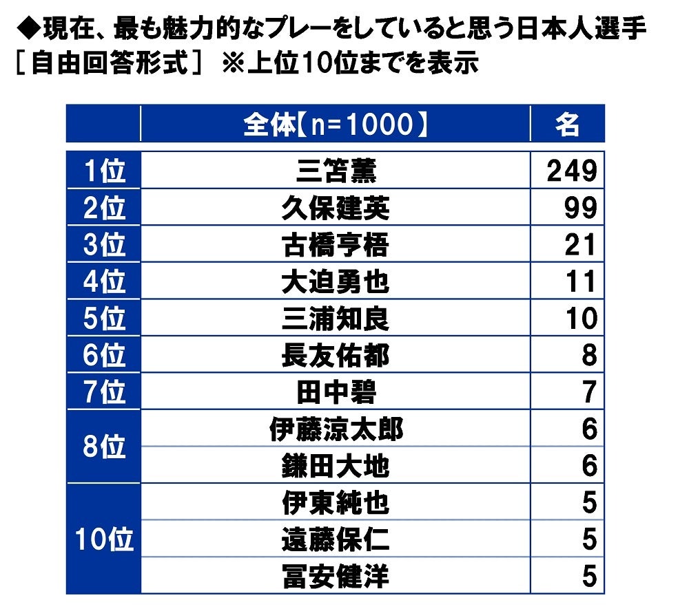 全回答者(1,000名)に、現在、最も魅力的なプレーをしていると思う日本人選手を聞いたところ、「三笘薫」(249名)がダントツでした。ドリブルの突破力や判断力の良さなどを武器に、チームの勝利に大きく貢献している点を魅力的に感じている人が多いのではないでしょうか。次いで、2位「久保建英」(99名)、3位「古橋亨梧」(21名)、4位「大迫勇也」(11名)、5位「三浦知良」(10名)となりました。