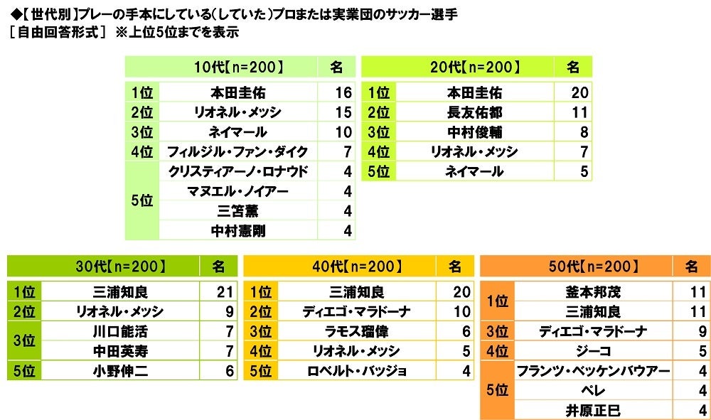 また、回答者のプレーしている(していた)ポジション別にみると、1位に挙がった選手と手本にしている(していた)ところは、ポジションがゴールキーパーの人では「川口能活」(立ち居振る舞い)、ディフェンダーの人では「長友佑都」(チャンス時のオーバーラップ)、ミッドフィルダーの人では「リオネル・メッシ」(細かいボールタッチ)と「三浦知良」(ドリブルの上手さ)、フォワードの人では「三浦知良」(周囲への適応力)でした。手本にしている(していた)ところには、単なる見た目の上手さや技術力の高さだけではなく、素人ではあまりわからないような“経験者ならでは”の評価ポイントも多く挙げられました。
