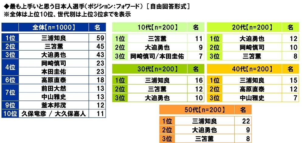 世代別にみると、10代では「三笘薫」、20代では「大迫勇也」、30代以上では「三浦知良」が1位でした。