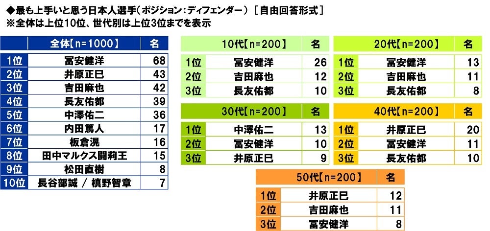 世代別にみると、10代と20代では「冨安健洋」、30代では「中澤佑二」、40代と50代では「井原正巳」が1位でした。