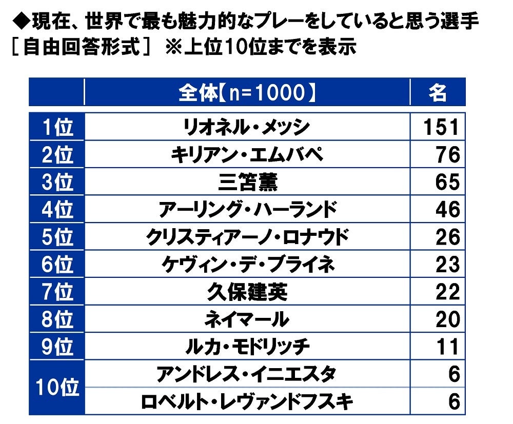 1位「リオネル・メッシ」2位「キリアン・エムバペ」3位「三笘薫」