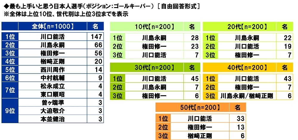 世代別にみると、10代と20代では「川島永嗣」、30代以上では「川口能活」が1位でした。