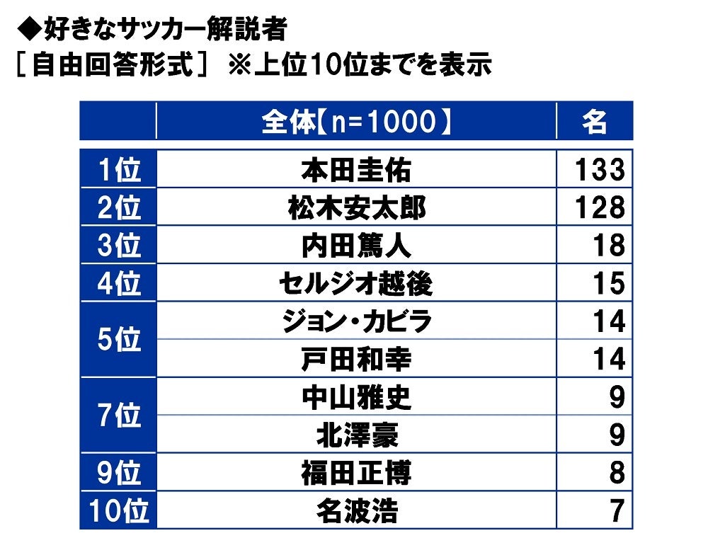 好きなサッカー解説者を聞いたところ、1位「本田圭佑」(133名)、2位「松木安太郎」(128名)、3位「内田篤人」(18名)、4位「セルジオ越後」(15名)、5位「ジョン・カビラ」「戸田和幸」(いずれも14名)となりました。
