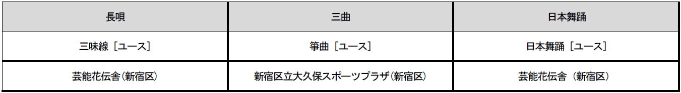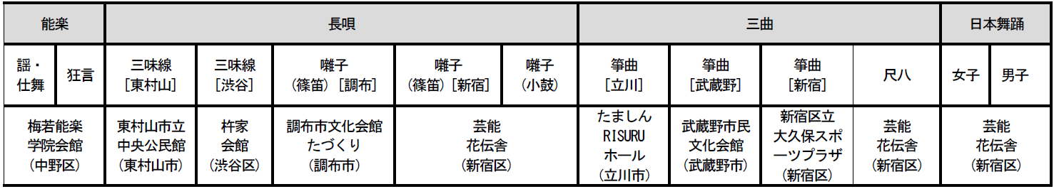 「キッズ伝統芸能体験」には、きめ細かい16回の稽古でじっくりと取り組む「スタンダードプログラム」(小中高生向け)と、内容の濃い10回の稽古で集中的に取り組む「ユースプログラム」(中高生向け)があります。今年度は、区部4か所の稽古場のほか、東村山市立中央公民館(東村山市)、調布市文化会館 たづくり(調布市)、たましんRISURUホール(立川市)、武蔵野市民文化会館(武蔵野市)で実施します。