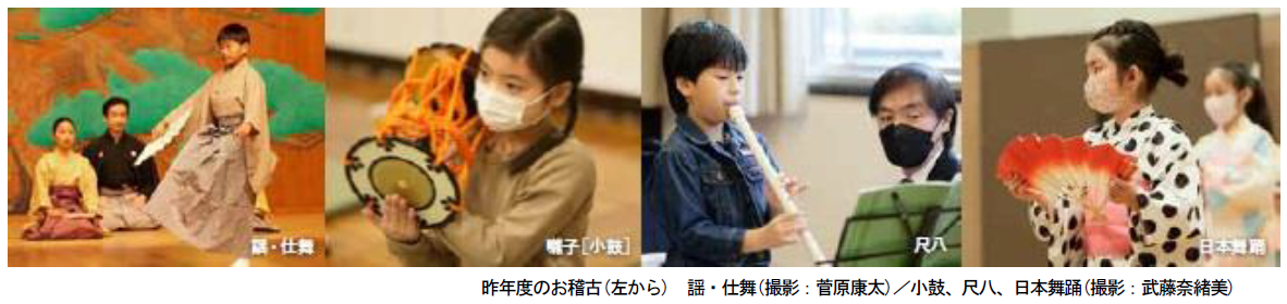 能楽、長唄、三曲、日本舞踊のプロの実演家から小中高生が一定期間にわたり直接指導を受け、稽古の成果を舞台で発表する本格的な体験プログラムです。