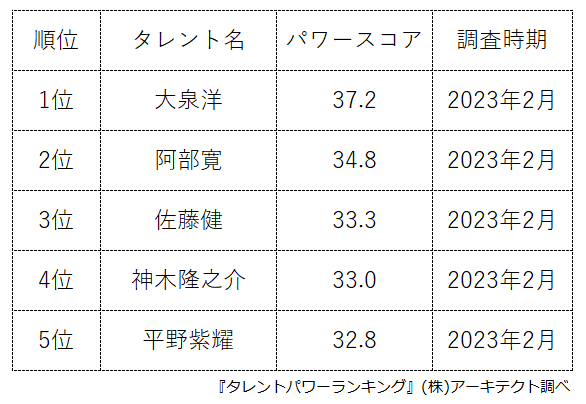 本ランキングは、2023年2月度に実施したタレント調査データ(一部過去実施データ)を利用し、タイトルに応じてランキング形式でまとめたものです。