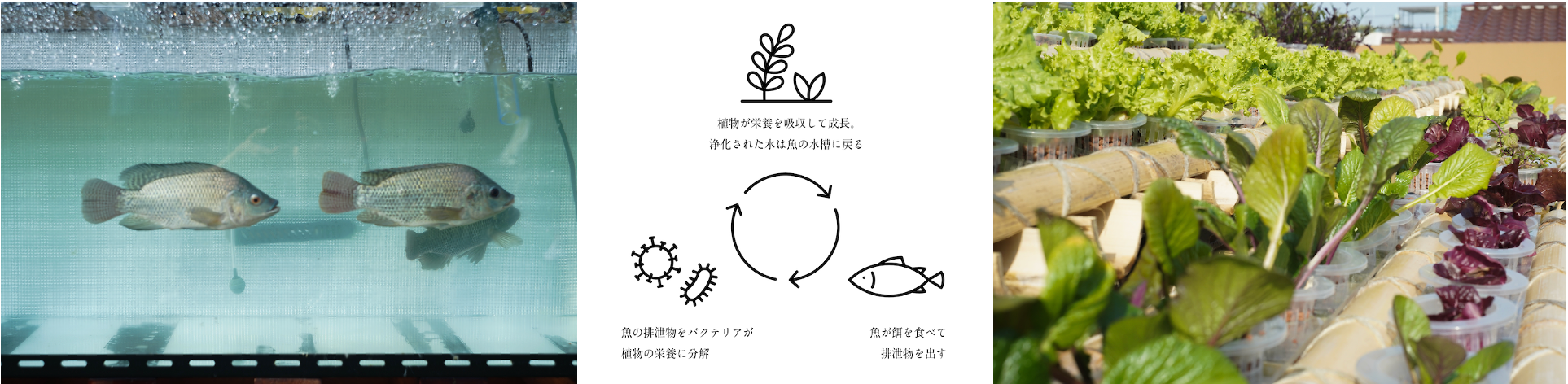 「アクアポニックス」とは養殖排水を活用した水耕栽培です。養殖排水に含まれる魚の残餌や排泄物は、バクテリアが分解すると植物の栄養になります。そして、植物が栄養を吸収することで水が浄化されキレイな水が水槽に戻る循環型のシステムを採用しています。養殖魚、バクテリア、野菜、それぞれが元気に過ごせる共生環境を作り出す、小さな地球のようなシステムと言えます。 AGRIKO FARM ではハーブや葉物野菜の栽培と、生命力が強く味わいが「鯛」に似ていることで注目されるイズミダイや琵琶湖に生息するホンモロコの養殖を同時に行います。野菜は、農薬・化学肥料などは不使用、魚も抗生物質などを使用せず自然に極力近い環境に少しお手伝いする形で育てています。また、循環に必要な栽培設備には、建築廃材や竹害に悩む地域から竹を譲り受けて活用しています。
