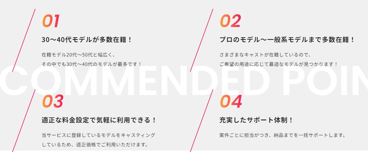 特に30代~40代のモデルに特化しており、プロモデル~初心者モデルまで多数在籍しておりますので、イメージに合ったモデルが見つかります。