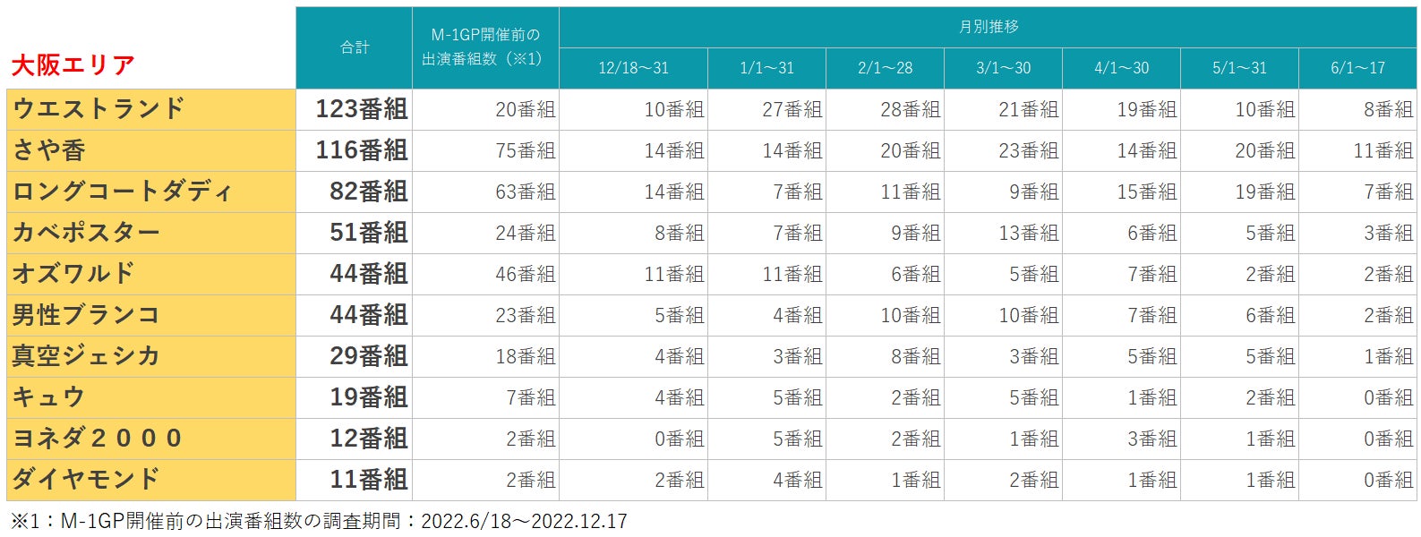 調査方法:「M-1 グランプリ 2022」決勝出場コンビ(※1)が、調査対象で放送されたテレビ番組へコンビで揃って出演(コンビのどちらかが単独で出演している場合は対象外)した番組数を集計し「総合、月別エリア別(関東/関西)」にてランキング。